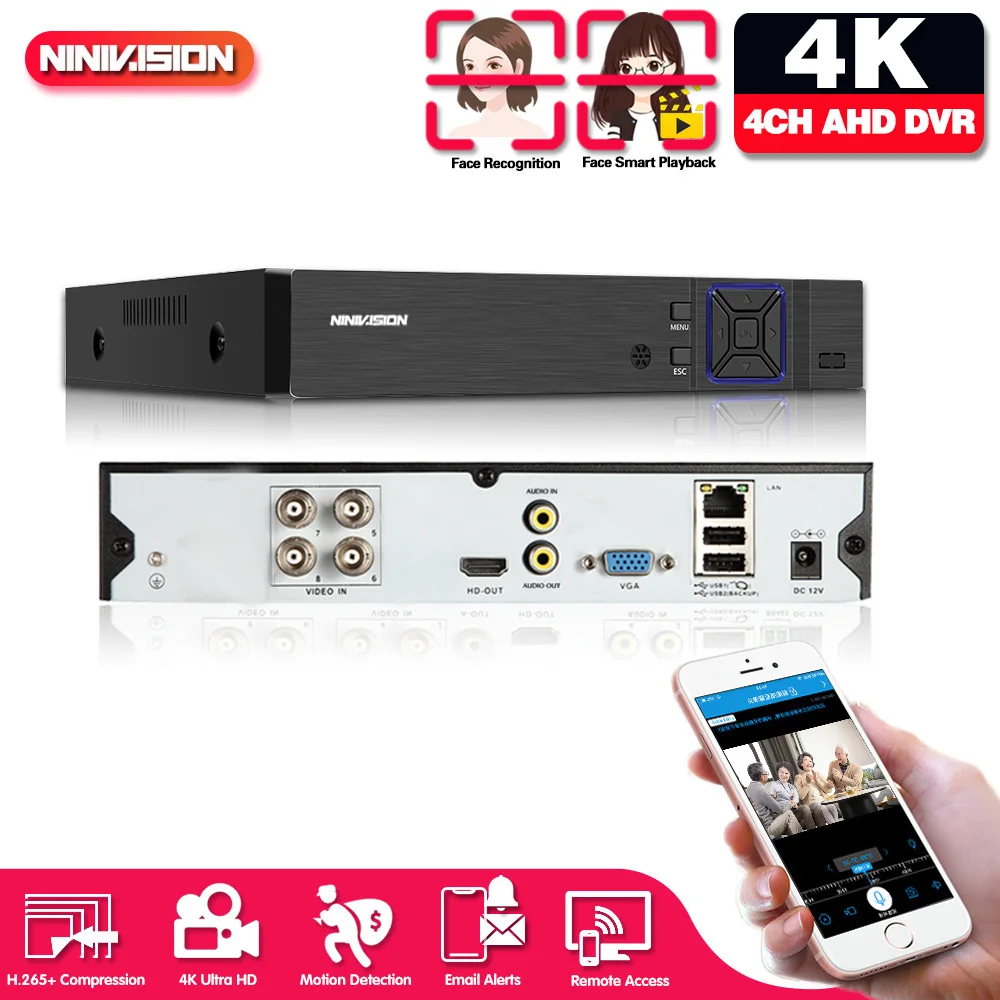 NINIVISION 4CH 8CH 16CH 4K 8MP 5MP 1080P Гибридный AHD DVR Запись AI Обнаружение движения человека распознавание лица и интеллектуальное воспроизведение оповещения по электронной почте CCTV аудио видео регистратор видеонаблюдения 4 8 16 каналов 8.0MP 5.0MP 1080P сетевой видеорегистратор для безопасности система камеры