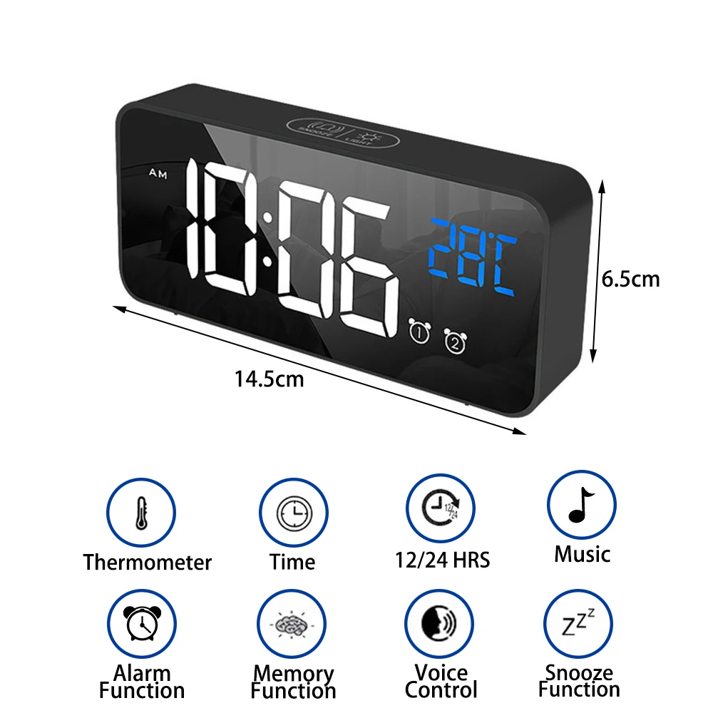 Особенности: Большой светодиодный цифровой дисплей: время, влажность и температура могут быть легко читаются.Функция проекции: время проекта, регулируемый фокус, 3-уровня яркость проекции, можете вращать проекции 180 °.Автоматический светильник-Регулировка: в этом режиме яркость проекции не может автоматически регулироваться в соответствии с яркостью inddor.Функция fm-радио: Ручной FM, время прослушивания может быть установлено, автоматическая станция поиска.Двойная функция будильника: 2 будильника можно установить в любое время отдельно, а также установить режим повтора.Функция внутреннего термометра: Отображение температуры в реальном времени, 12 ч/24 ч режимов.4 уровня яркости дисплея можно регулировать вручную по мере необходимости.Экран отличается особым прогрессом, который может использоваться в качестве зеркала для макияжа.Встроенная функция отключения памяти. Характеристики: Материал: АБС-пластикВход USB: 5 В постоянного токаЦвет корпуса часов: черный/белыйЦвет часов: синий/белый/синий/зеленыйРазмер (около):Стиль A : 183*75 ммСтиль B : 180*95 ммFM частота: 87,5-108 МГцПроекционное расстояние: 0,5-5 мРегулировка громкости: 0-15 уровнейФормат часов: 12 ч/24 чРегулировка яркости: 4 уровняБатареи: 1 * CR2032 (в комплекте) / DC 5 В Посылка включает: Будильник с проекцией времени:-- 1 * проекционные часы-- 1 * CR2032-- 1 * USB кабель-- 1 * Руководство пользователяМузыкальный будильник ( Функция проекции отсутствует ):-- 1 * музыкальные часы-- 1 * USB кабель-- 1 * Руководство пользователяЧасы голосового управления ( Функция проекции отсутствует ):-- 1 * голосовой пульт управления-- 1 * USB кабель-- 1 * Руководство пользователя