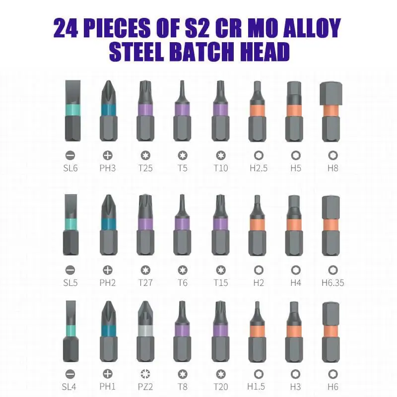 Несколько вариантов партииS2 хромово-молибденовая легированная сталь, Сочетается с непрерывным процессом термической обработки, жесткий, но не хрупкий и полный прочности. ВПростой в идентификации дизайн цветного кольца, Головка партии проста в использовании, и она ясна и ясна. 24 шт., 5 видов партий, для удовлетворения потребностей профессионального использования, домашней жизни, работы, DIY, обслуживания и т. д.