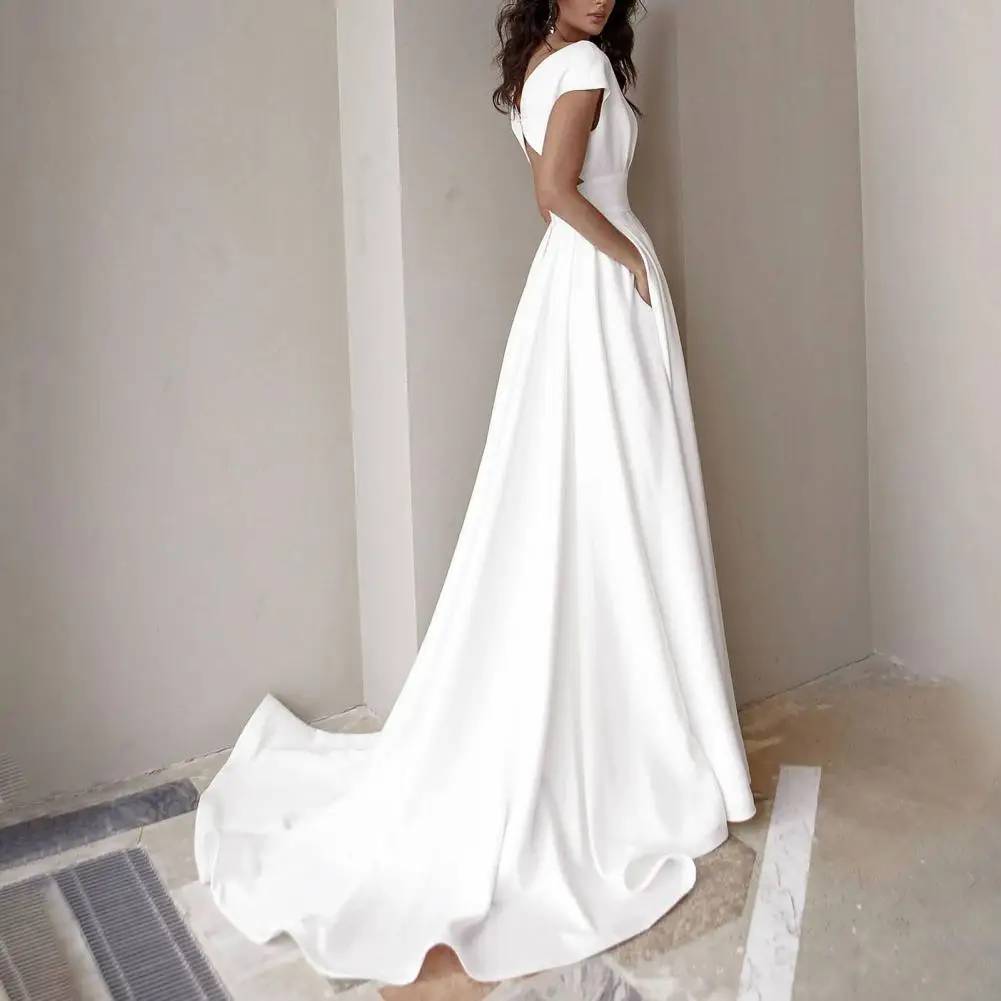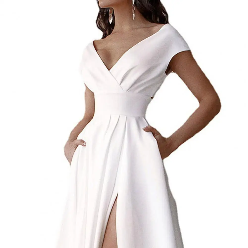 Формальные Вечерние платья с v-образным вырезом, однотонное белое платье с высокой талией, коротким рукавом, разрезом по бокам, длиной до пола, с карманами, вечерние платья