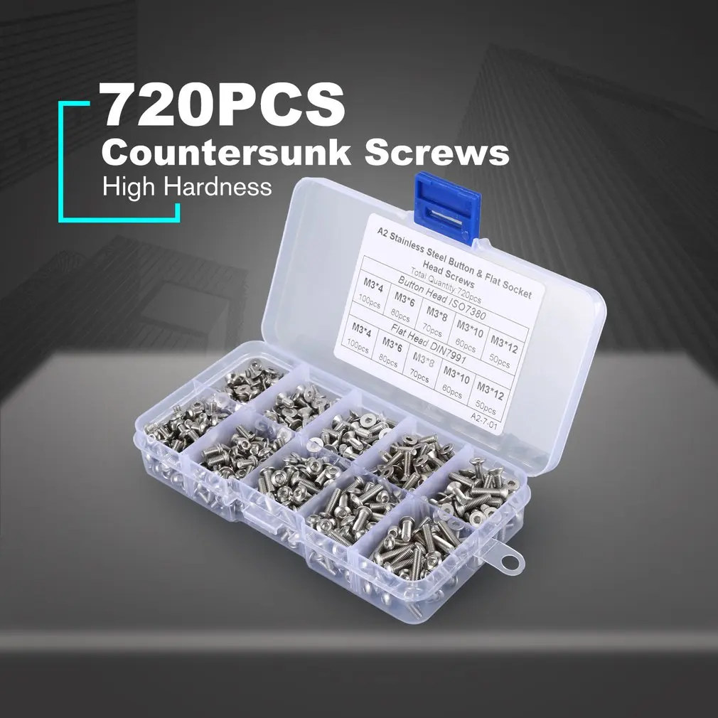 720 шт. Нержавеющая сталь Inox плоские винты с потайной шестигранной головкой Кепки шестигранный ключ винты с шестигранной головкой комплект кабельные наконечники в наборе для M3 * 4/6/8/10/12 мм