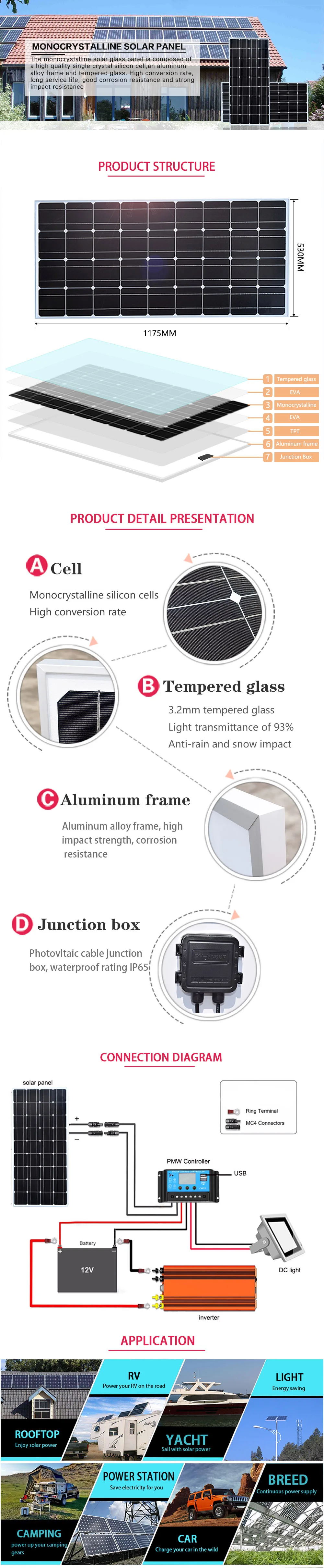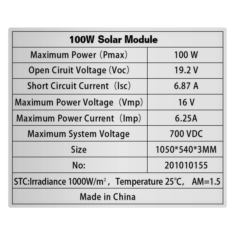Материал ячейки: монокристаллический кремнийЭТФЭ поверхностиМаксимальная мощность (Pmax): 100 ВтОткрытое циркулярное напряжение (Voc): 19,4 вКороткий Циркулярный ток (Isc): 6.5AМаксимальное напряжение питания (Vmp:16vМаксимальная сила тока (Imp): 6.2AРазмер: 1050*540*3 ммМаксимальное напряжение системы: 700VDCРаспределительная коробка: класс IP67STC: облучение 1000 Вт/м2 температура 25 ℃ AM = 1,5Рабочая температура: -20 ℃-+ 80 ℃Максимальная мощность должна быть протестирована в солнечную погоду 12:00-14:00, нет укрытия и вертикального угла солнца