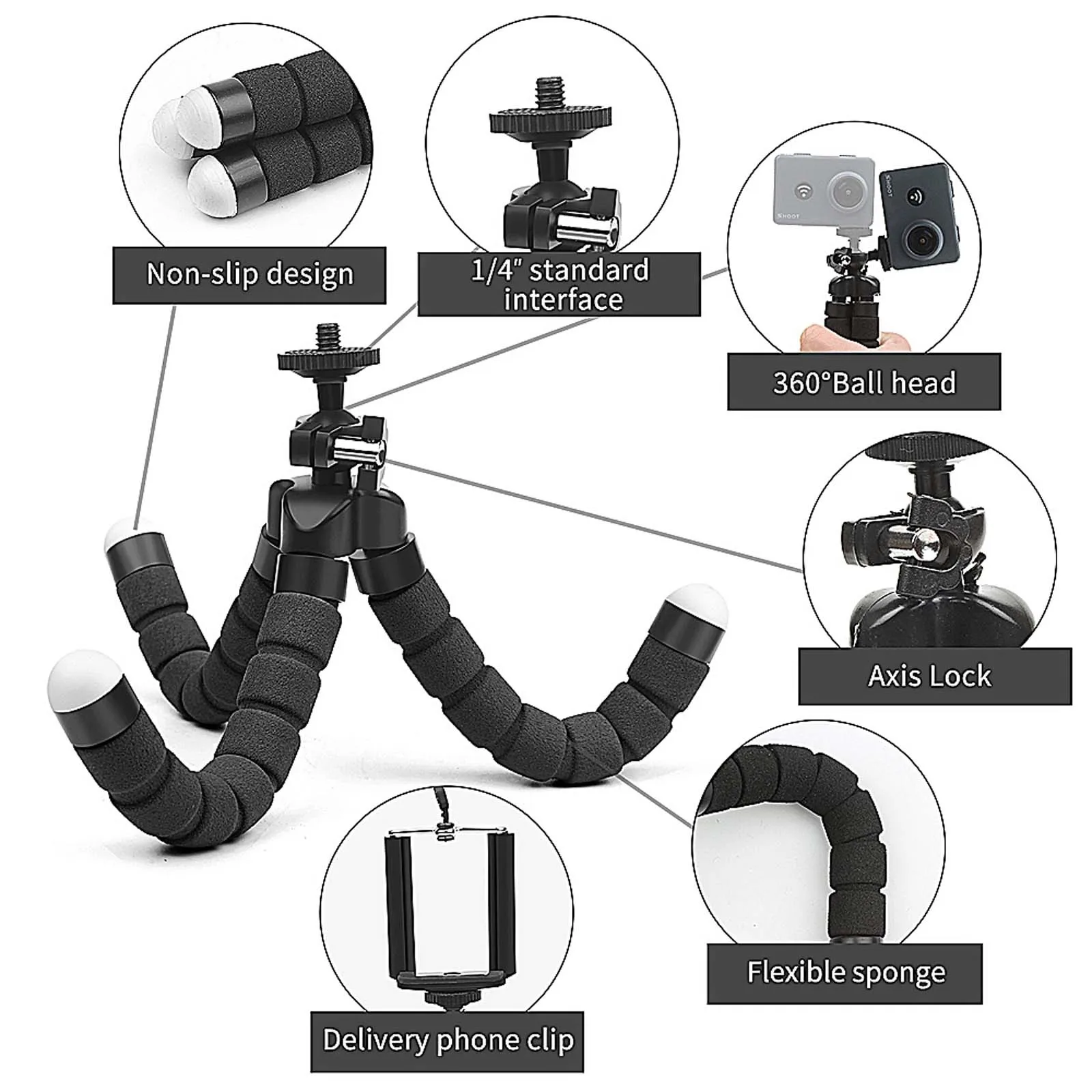 Универсальная совместимость: Этот телефон Характеристики штатива с 1/4 винтом сверху, и как только мяч удаляется из Соединение, вы увидите адаптер для Go Pro или спортивной камеры. Так что вы можете Устанавливайте на него различные устройства, если они не тяжелые, как смартфон, Экшн-камера, легкая камера, веб-камера, проектор....