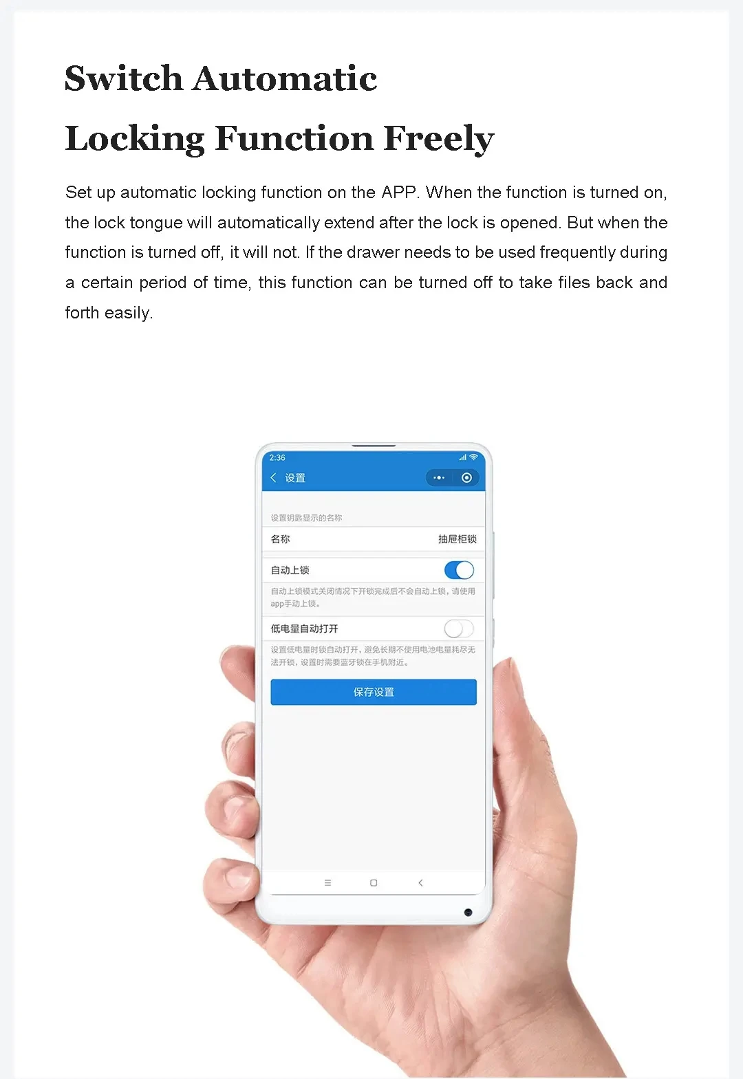 Не хочу, чтобы другие ворвались через важные документы и личные вещи в вашем ящике офиса. При использовании традиционного механического замка коллеги спешат запрашивать ваши документы, и вы не можете своевременно сдавать или терять ключ. Этот умный замок безопасен и также свободенАвторизация ekeysВ приложении для повышения эффективности работы.