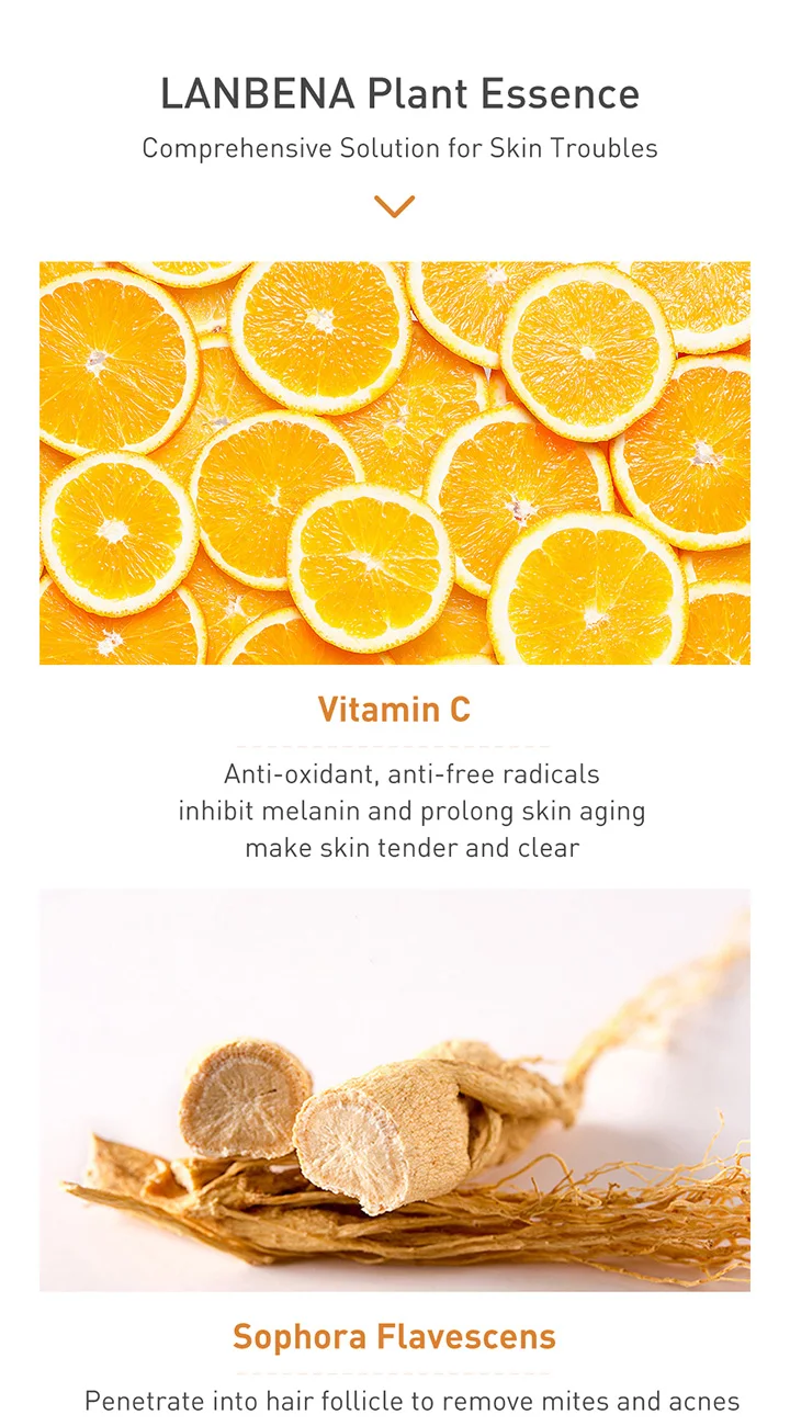 Растительная эссенция LANBENAКомплексное решение проблем с кожейВитамин САнтиоксидант, свободные радикалы, подавляют меланин и продлевают старение кожи, делают кожу нежной и чистойSophora FlavescensПроникает в волосяной фолликул для удаления клещей и акнеАрбутинПодавляет активность тирозиназы, останавливает выработку меланина