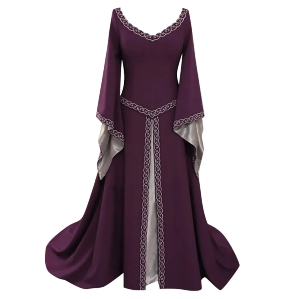 Женское платье с длинным рукавом и V-образным вырезом, средневековое платье в пол для косплея, женское однотонное платье принцессы в стиле ретро с расклешенным рукавом