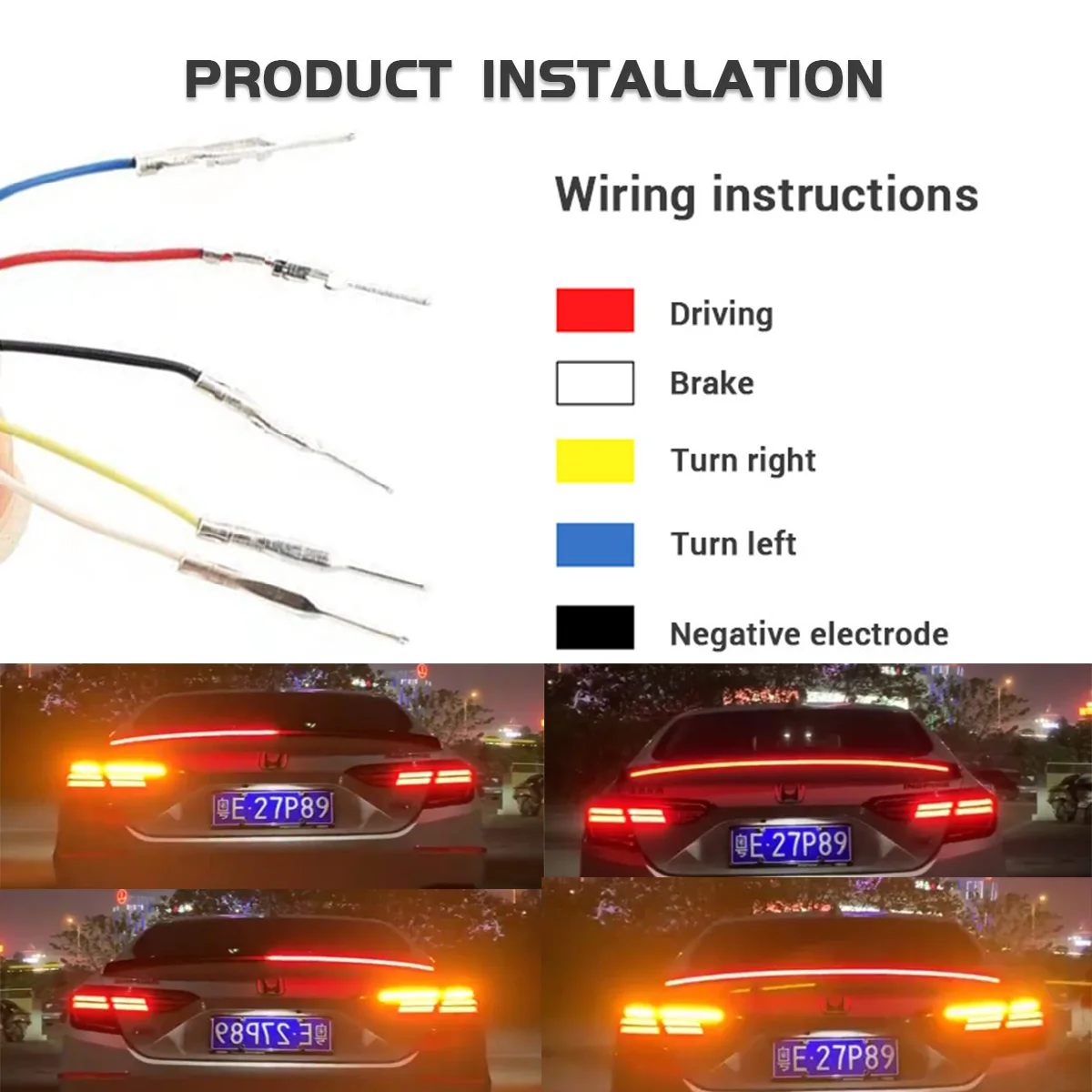 Посылка включает в себя:1 комплект Автомобильный светодиодный спойлерПроводное Соединение:-Красный: подключите положительный полюс-Черный: Подключите отрицательный полюс-Белый: Подключите тормозной светильник-Желтый и синий: Подключите сигнал поворота