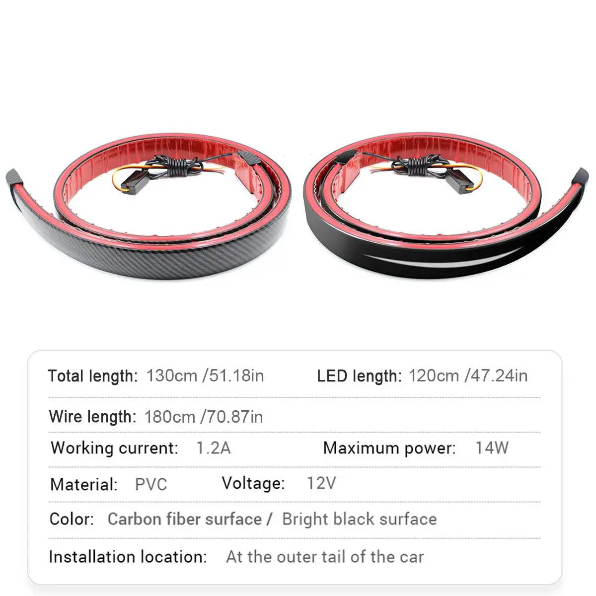 Характеристики:-Материал: ПВХ + светодиодный-Цвет спойлера: глянцевый черный-Светодиодный светильник; Цвет: красный-Напряжение: 12 В-Ток: 1,2 A-Мощность: 14 Вт-Водонепроницаемость: Да-Длина спойлера: 130 см/51,18 дюйма-Светодиодный светильник L enth: 120 см/47,24 дюйма-Длина провода: 180 см/70,87 дюйма