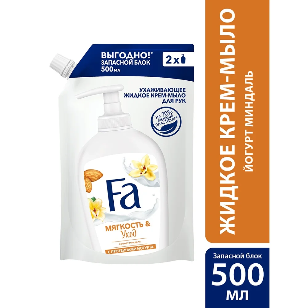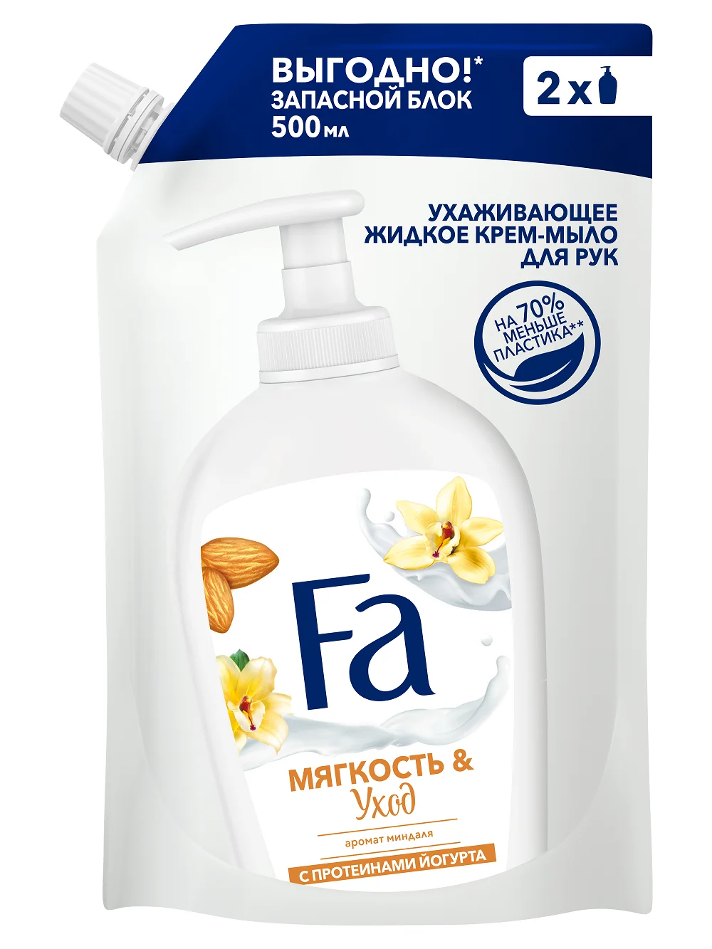 Fa Жидкое крем-мыло запасной блок мягкость и уход аромат миндаля с протеинами йогурта. Насладись нежным ароматом миндаля. Нежная и ухаживающая формула жидкого мыла с протеинами йогурта окутывает кремовой пеной и способствует защите кожи от сухости. Без минеральных масел, pH-нейтральный к коже, дерматологически протестирован, подходит для частого применения. На 70% меньше пластика!*