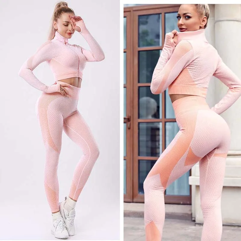 Женские Бесшовные костюмы для йоги из 2 предметов, одежда для тренировок и фитнеса, спортивная одежда пуш-ап, одежда для спортзала, костюмы с длинным рукавом + леггинсы