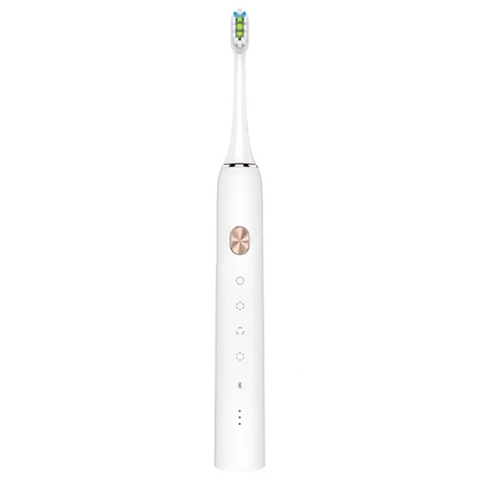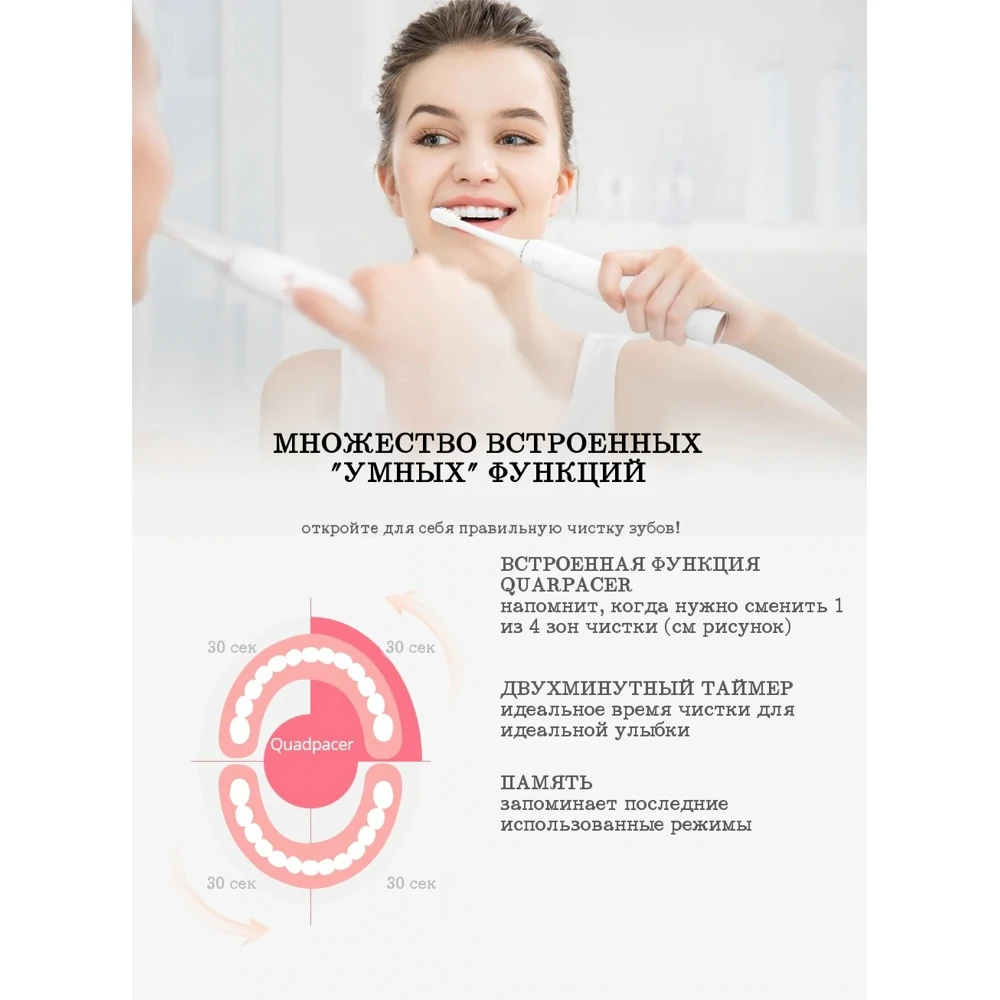 Ультразвуковая, отбеливающая. Функция Quadpacer. 4 режима работы: ежедневная/деликатная чистка, отбеливание, массаж. Частота вращений 39600 р/мин. 3D-щетинки DuPont 0,152 мм. Размеры: 25.3*2.8 см, вес: 275 г.