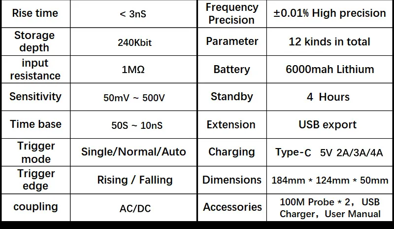 Особенности:Интеллектуальная защита от ожогов, 1X Выдерживает напряжение до 400 В.100 МГц аналоговая полоса пропускания @ 1GSa/s частота дискретизации (1X = 5 МГц, 10X = 100 МГц).Полностью подходит для 7 дюймов 800*480 цветной TFT ЖК-дисплей с яркими цветами и высокой контрастностью.Емкостный сенсорный экран, такой же, как и Сенсорный режим современного мобильного планшета, не является резистивным сенсорным экраном с древней операцией ногтей.Диапазон высокого напряжения, 1x может измерить 0 ~ 40 В, 10x может измерить 0 ~ 400 В, 100x может измерить 0 ~ 4000 в.До 12 параметров измерения: VPP, VP, Vmax, Vmin, Vavg, Vrms, частые, Duty +, Duty-, Time +, Time-, Period.Функция измерения курсора, удобно вручную измерять период, частоту и напряжение.Полная функция запуска (одиночная, нормальная, автоматическая).В любое время дисплей формы волны (Функция паузы) заморожен.Оснащен высокой эффективностью одной кнопкой авто.Одна кнопка хранения сигналов и скриншот.Встроенная память объемом 1 ГБ позволяет хранить до 1000 скриншотов + 1000 наборов данных волноводной формы.Мощный Графический менеджер поддерживает просмотр эскизов, просмотр, Детальный просмотр, поворот страницы, удаление и масштабирование формы волны, масштабирование, перемещение и т. Д.Оснащен интерфейсом USB, который может быть подключен к компьютеру, чтобы поделиться скриншотами с компьютером, что удобно для вторичного анализа.Функция графического дисплея Lissajous может использоваться для определения амплитуды, частоты и фазового контраста двух групп сигналов.Функция отображения FFT, может анализировать Спектральные характеристики сигнала.Встроенный перезаряжаемый литиевый аккумулятор емкостью 6000 мАч, полностью заряжен в течение 4 часов непрерывного использования при максимальной яркости экрана.Технология сжатия памяти, экран обновления формы волны не мерцает.Регулировка яркости экрана.Регулировка яркости фоновой сетки.Ультратонкий, легко носить с собой.
