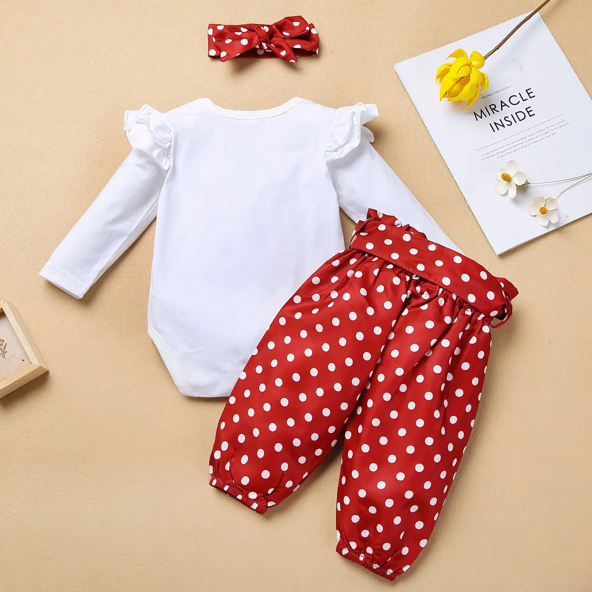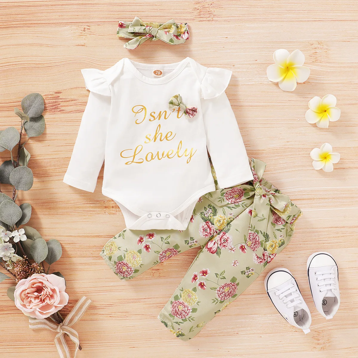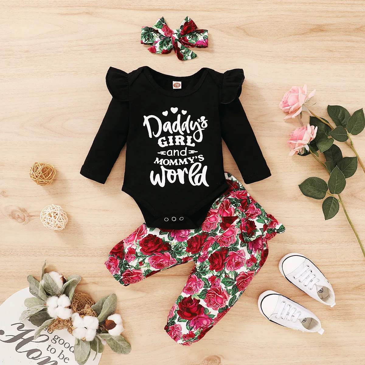 Комбинезон для новорожденных девочек 3 шт., одежда для отдыха на осень и зиму, комбинезон с длинным рукавом, боди, штаны с цветочным принтом, повязка на голову с бантом на 6, 12, 18 месяцев
