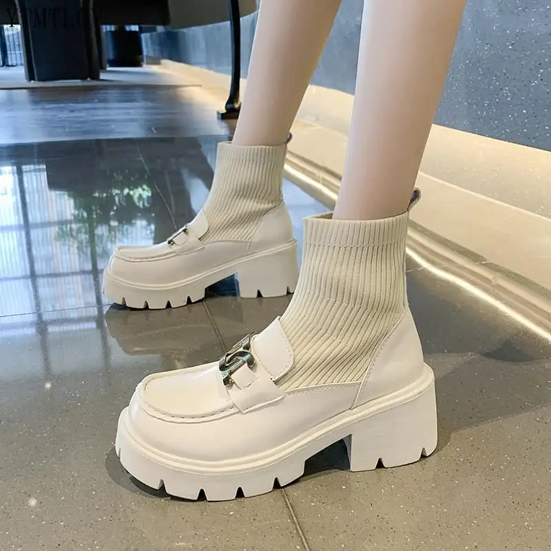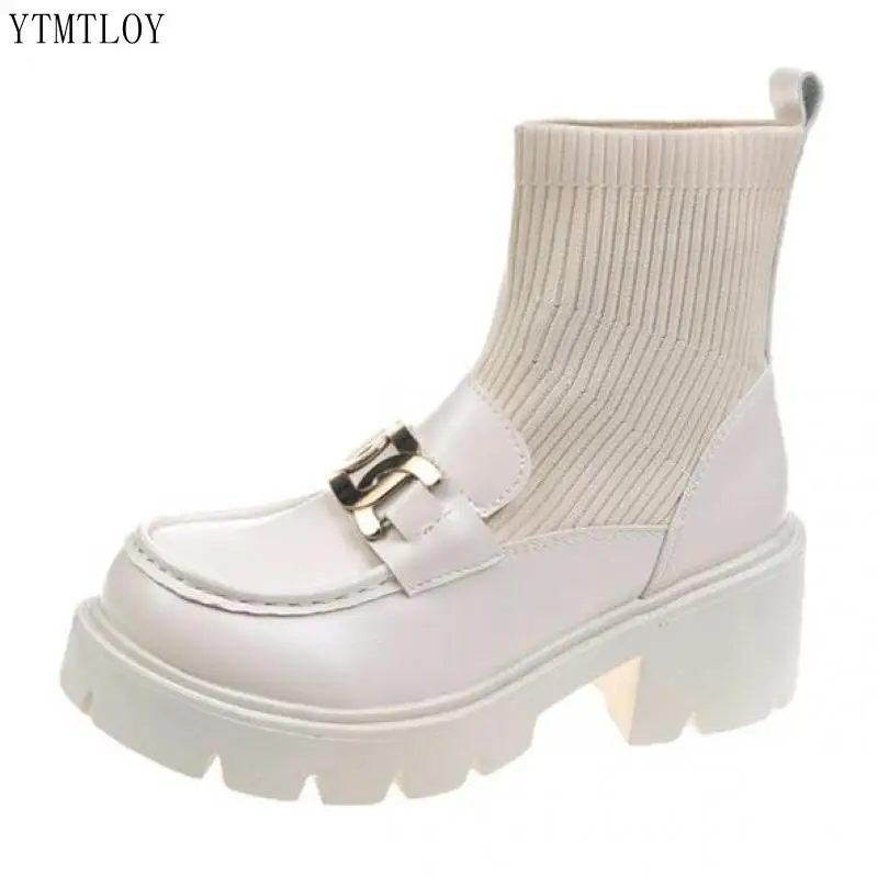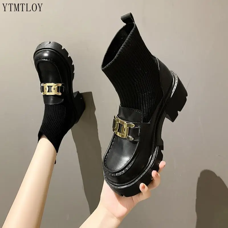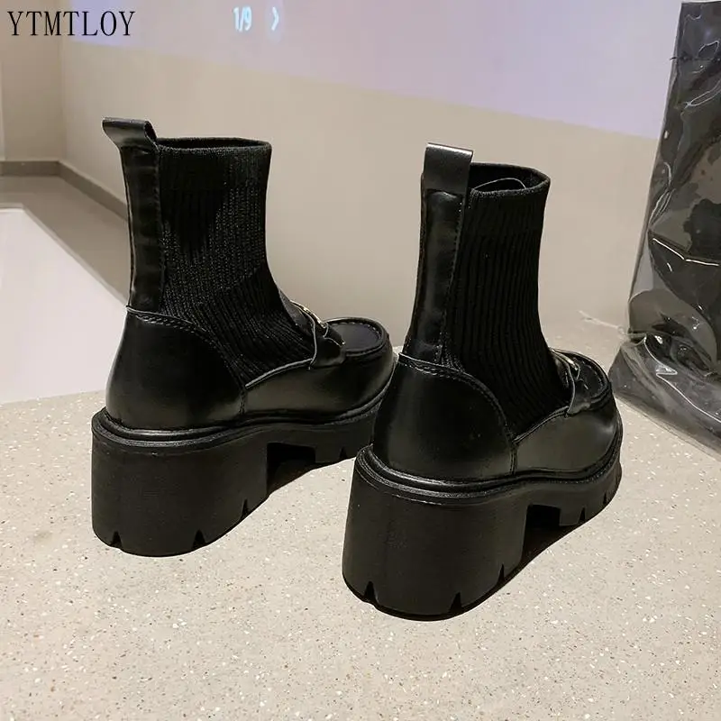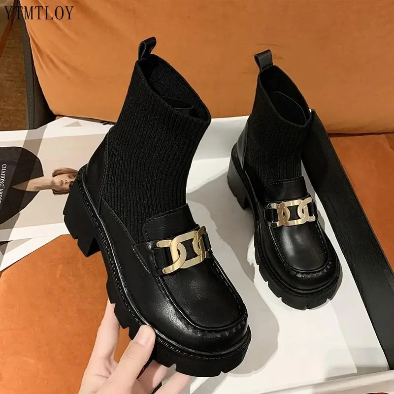 INS Лидер продаж, вязаные эластичные сапоги из натуральной кожи с металлической цепочкой 2022, зимняя модная обувь на массивном блочном каблуке, сексуальная обувь Ytmtloy с квадратным носком