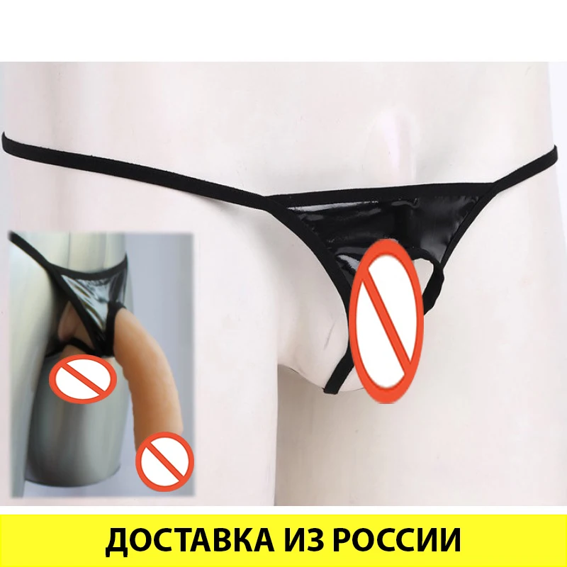 Трусы-стринги мужские из лакированной кожи, с отверстиями для пениса