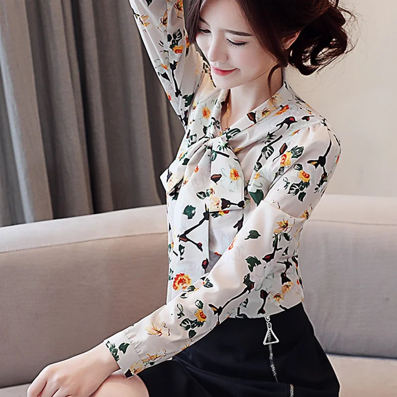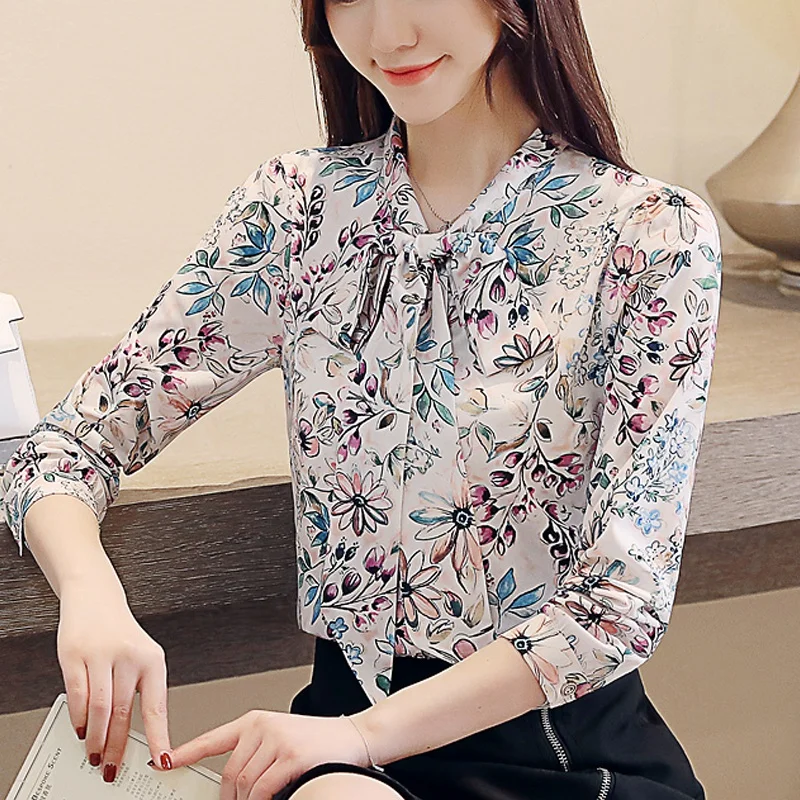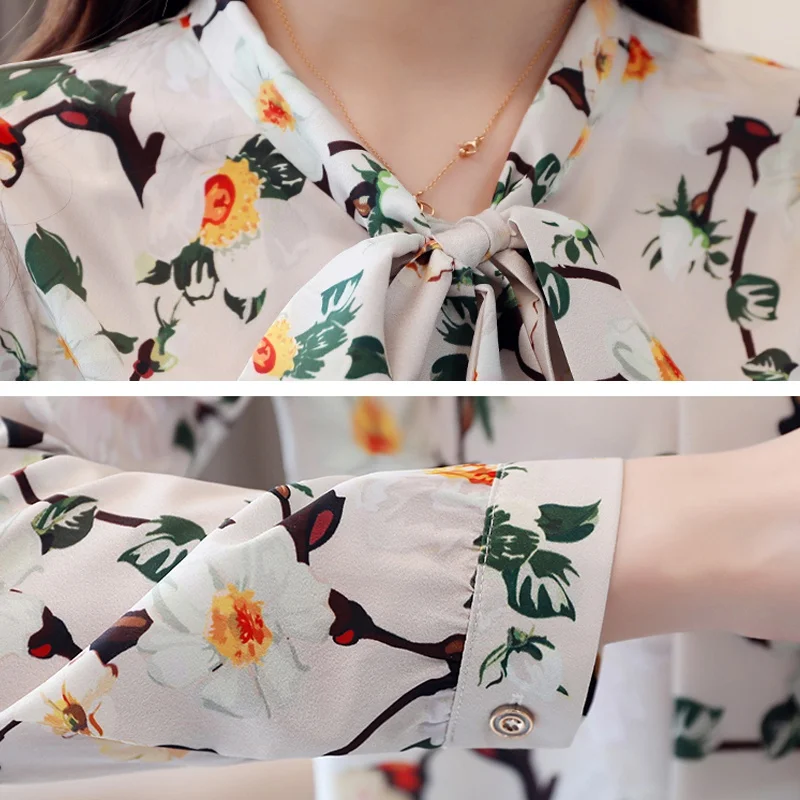 Осенняя женская рубашка, корейский Топ с длинным рукавом, шифоновая блузка с принтом, повседневные рубашки с бантом, женская блузка