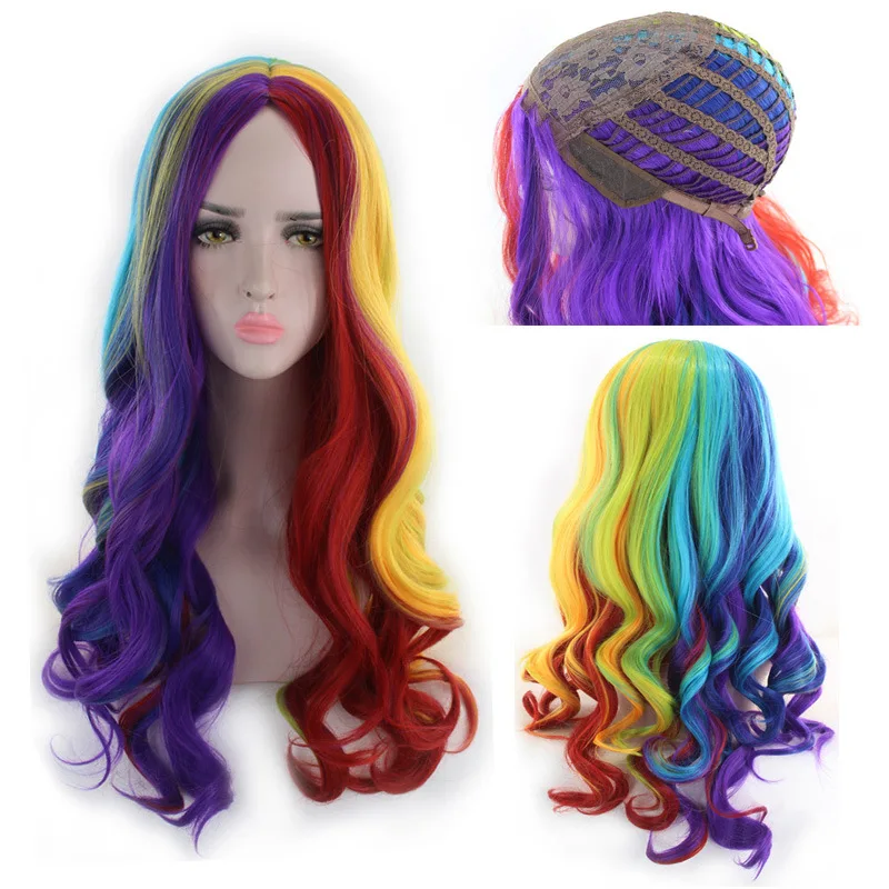 68 см женские парики для косплея Лолита разноцветные строчки женский длинный парик изогнутые крупные волнистые черные и белые синие розовые цветные парики