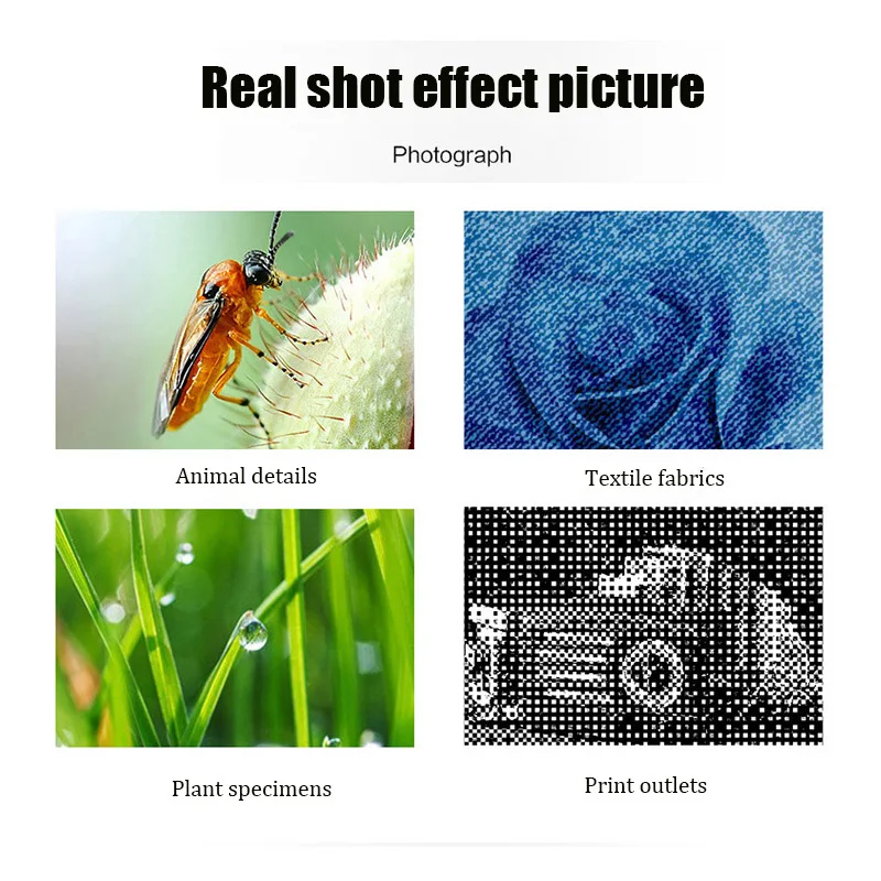1.1600X Увеличение: 1600x увеличивает, фиксирует четкие детали. Встроенный 8 светодиодный светильник. 2. Высококачественный Карманный микроскоп: Высококачественная противоскользящая ручка, Удобная и прочная. Этот портативный микроскоп является идеальной игрушкой для детей, чтобы исследовать микро мир, а также подходит для людей, которые любят наблюдать за насекомыми, кожей, печатной платой и многими интересными предметами. 3. Тщательная проверка, проверка текстиля, проверка ювелирных изделий, инспекция коллекций/монет, инспекция печати, инспекция PCB orPCBA и так далее. 4. Микроскоп состоит из высококачественных IC и электронных компонентов, с четким качеством изображения, низким энергопотреблением, высоким разрешением, применяется к маленьким объектам, чтобы быть больше. 5. Фото-и видеосъемка-лучший выбор распознавания мелких объектов. Основные характеристики: 1. Датчик изображения: 0,3 м HD CMOS сенсор 2. Разрешение фото: 640x480 3. Разрешение видеозахвата: 640x480 4. Диапазон фокусировки: ручной фокус от 15 ~ 44 мм 5. Частота кадров: макс. 30f/s 6. Увеличение: 1600X 7. Формат видео: AVI Другие характеристики: 1. Регулируемое освещение: 8 встроенных светодиодный диодов 2. Формат съемки: JEPG/BMP 3. Интерфейс ПК: USB3.0, USB2.0 и USB1.1 4. Источник питания: порт USB (5 В постоянного тока) 5. Поддержка системы: Win2000/2003/XP/Win7/Win8/Win10/Mac 10,13 и выше 6. Размер: прибл. 11x3 образования легкой пены. 3 см/4,33x1,18 дюймов, размер основания: 7x 8 см/2.76x3.25inch Посылка включает в себя:( В розничной упаковке) 1 x микроскоп Металлическая подставка-1 шт. CD-диск с программным обеспечением-1 шт. Калибровочная линейка-1 шт.