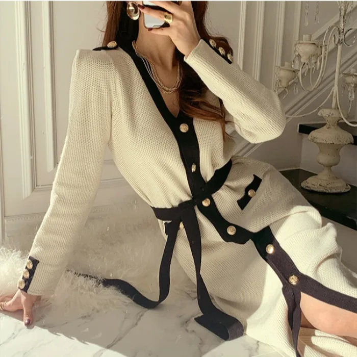 Женское трикотажное платье, однобортное приталенное платье-свитер, ...