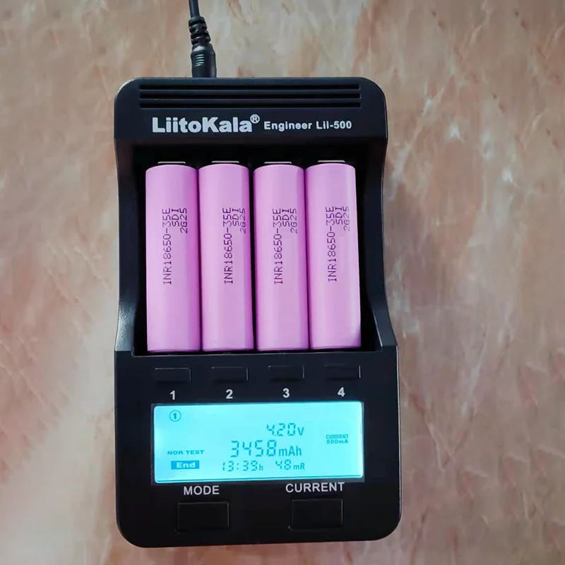Фактическая емкость 18650-35eОписание товара:Тип батареи: INR18650-3500Номинальное напряжение: 3,7 VСтандартная емкость: 3500 мАчВнутреннее сопротивление батареи: <30 мОмМетод зарядки: 4,2 V постоянного тока постоянное напряжениеМаксимальный ток заряда: 1C (3500mA) Батарея Размер: 18,5*65,2 мм (диаметр * высота)Особенности:1. Высокая производительность, маленький размер, светильник вес.2. Напряжение разряда стабильное.3. Высокая скорость непрерывного разряда.4. Небольшое внутреннее сопротивление.5. Отсутствие загрязнения, длительный срок службы.Информация о продукте:Высококачественные литий-ионные аккумуляторы INR18650-35E* Модель: 18650* Номинальное напряжение: 3,6 V* Стандартная емкость: 3350-3550 мАч* Сделано в Корее* Максимальный устойчивый ток разряда: 20A3. Информация о ребенке:1. Стандартный ток разряда: 20AЗарядка: 1.25A, 4,20 V, CCCV 100mA отключение,Разряд: 0.2C, 2,5 V разрядный отсек2. Номинальное напряжение: 3,6 V3. Стандартная зарядка: CCCV, 1.25A, 4,20 ± 0,05 В, 100 мА отключение4. Быстрая зарядка: CCCV, 4A, 4,20 ± 0,05 В, 100 мА отключение5. Время зарядки:Стандартная зарядка: 180 мин/100 мА отключениеБыстрая зарядка: 60 мин (при 25 °C) / 100 мА отключение6. Максимальный устойчивый ток разряда: 20A (при 25 °C), 60% при 250 циклах7. Критическое разрядное напряжение: 2,5 V8. Вес ячейки: 46,0 г Макс.9. Размер ячейкиВысота: 64,85 ± 0,15 ммДиаметр: 18,33 ± 0,07 мм
