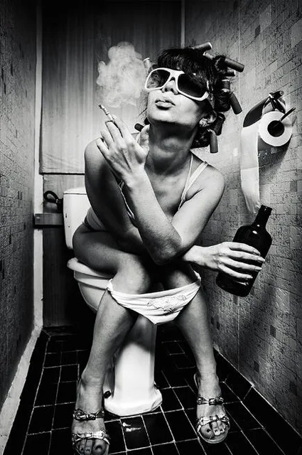 Женщина, сидя на унитазе, винтажная холщовая фотография, черно-бела...