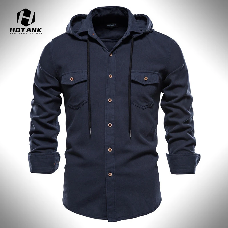 Мужская Повседневная рубашка с длинным рукавом, однотонная деловая рубашка из чистого хлопка с отложным воротником, модный Приталенный топ с капюшоном, большие размеры, осень 2022
