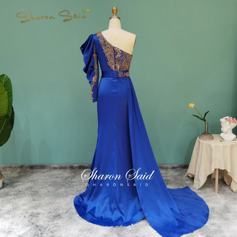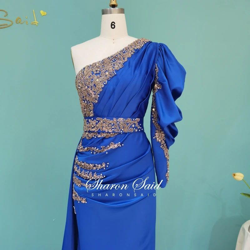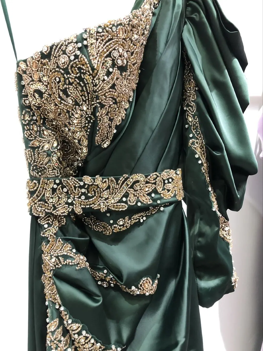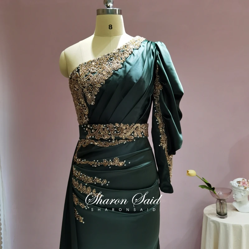 Женское вечернее платье с юбкой годе, элегантное изумрудно-зеленое платье с одним открытым плечом и длинным рукавом, украшенное бусинами, для выпускного вечера, свадебные платья