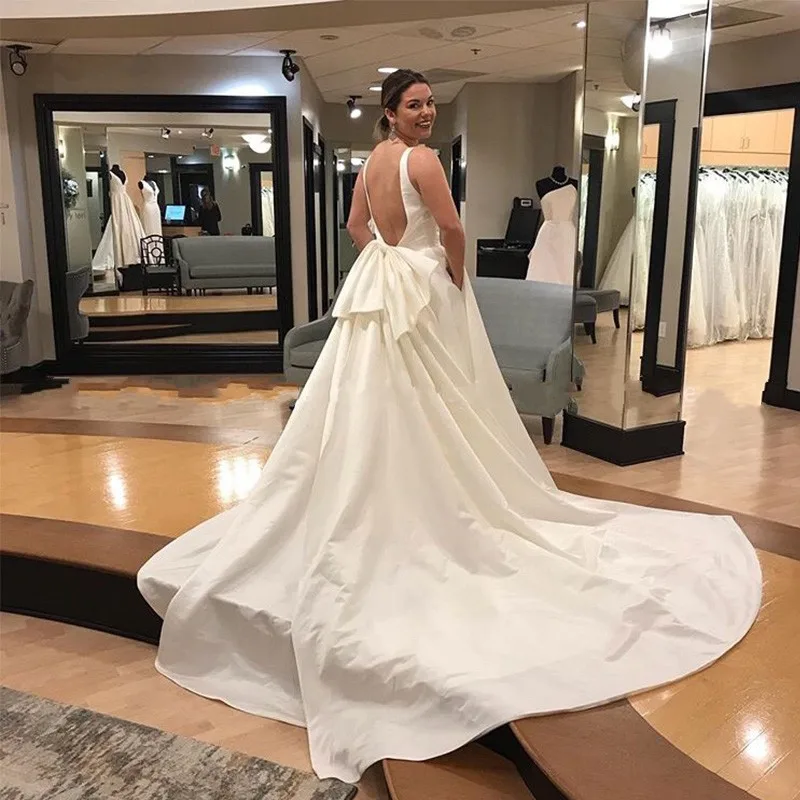 Платье свадебное атласное с глубоким V-образным вырезом, открытой спиной и карманами