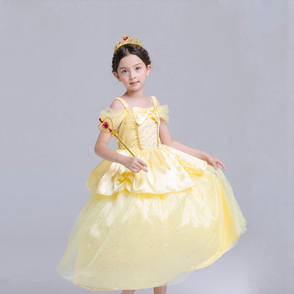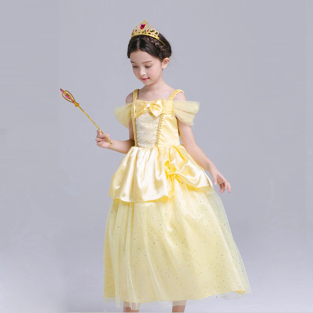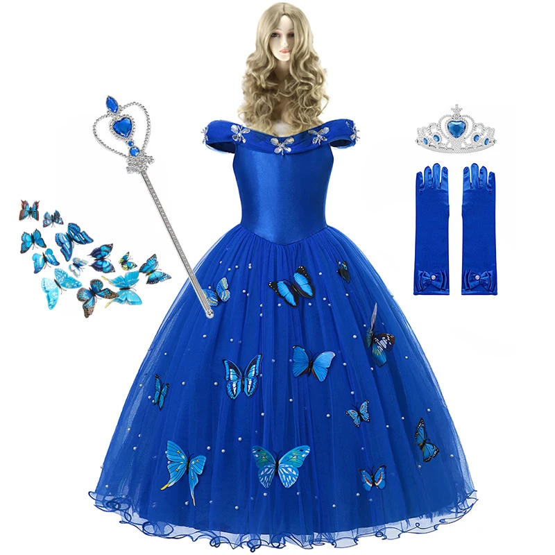 Платье Золушки для девочек, детское платье принцессы, вечерние ний костюм с открытыми плечами для девочек с париком и перчатками, волшебная палочка на новый год 2022