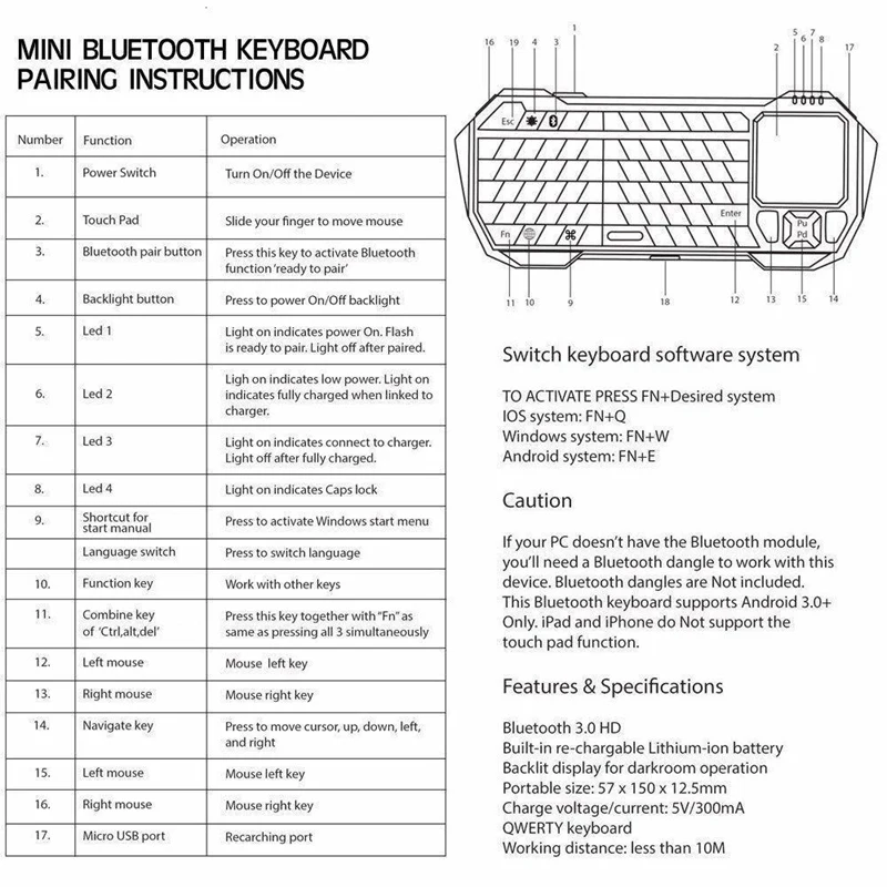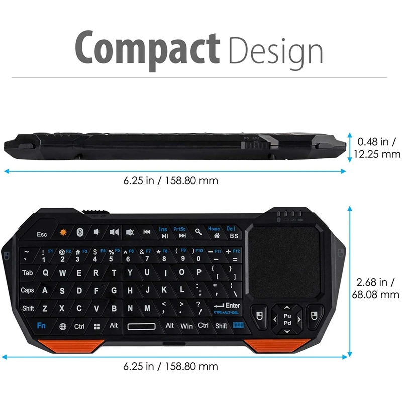 1. Компактная и портативная клавиатура QWERTY с тачпадом: Инновационная и компактная клавиатура QWERTY с тачпадом, обеспечивающая комфорт в сочетании с свободой беспроводного подключения. Подключитесь ко всем вашим любимым устройствам с помощью этой беспроводной клавиатуры.2. Миниатюрный и элегантный с подсветкой: Наслаждайтесь удобным набором текста и мультисенсорной навигацией прямо с дивана.3. Мультисенсорная панель и панель прокрутки-позволяют прокручивать, откидывать экран, щелкнуть мышью и смартфон.4. Долговечная перезаряжаемая батарея: Встроенная перезаряжаемая литий-ионная батарея 450 мАч. Светодиодный ные индикаторы сообщают, когда аккумулятор разряжен и когда он полностью заряжен. Зарядка через прилагаемый USB-кабель простая и легкая.5. Удобное переключение между IOS, Android и windows.Тип: Беспроводная клавиатура BluetoothСтандарт клавиатуры: мини-клавиатураЯзык: английскийПрименение: Рабочий столСтиль: для планшетаСтиль работы: емкостныйТип интерфейса: bluetoothДрайверы: Bluetooth 3,0Порт зарядки: Micro-USB 5 ВНапряжение: 3,7 вПодходит для: ПК и настольного компьютераЦвет: черныйМатериал: ПК + АБС-пластикРазмер: 160x68x13 ммПосылка1 клавиатура Bluetooth1 x USB-кабель для зарядкиВ комплект входит только указанное выше содержимое, другие продукты в комплект не входят.Примечание: светильник вая съемка и различные дисплеи могут привести к тому, что цвет товара на изображении будет немного отличаться от реального. Допустимая погрешность измерения +/- 1-3 см.