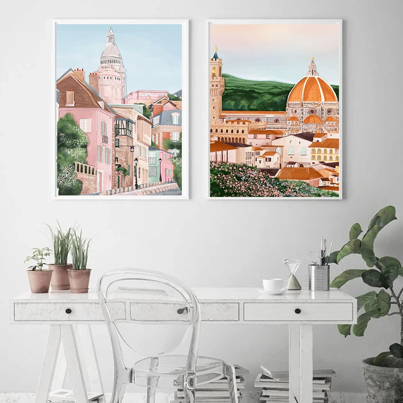 Пейзаж Плакат Мультфильм Путешествия город плакат Италия Париж Лондон Пейзаж Холст Искусство Декор для дома Внутренняя Живопись