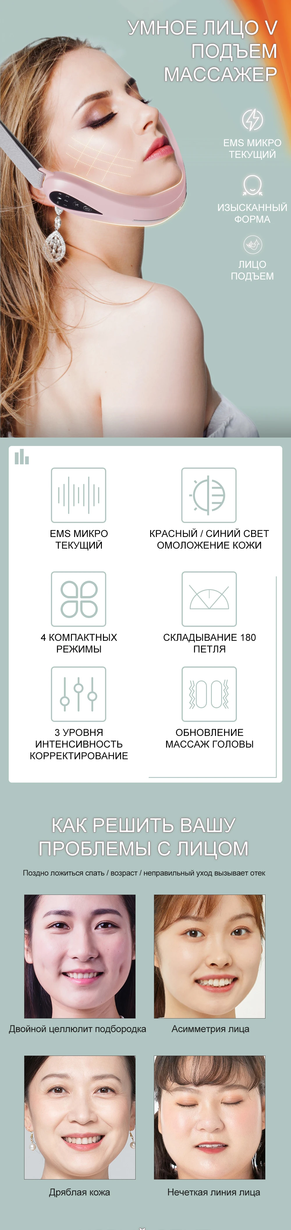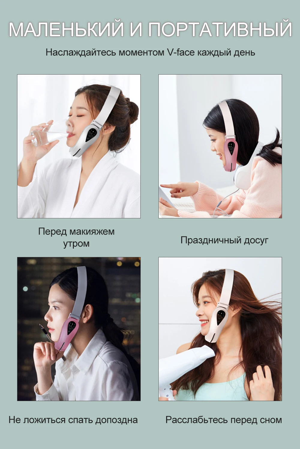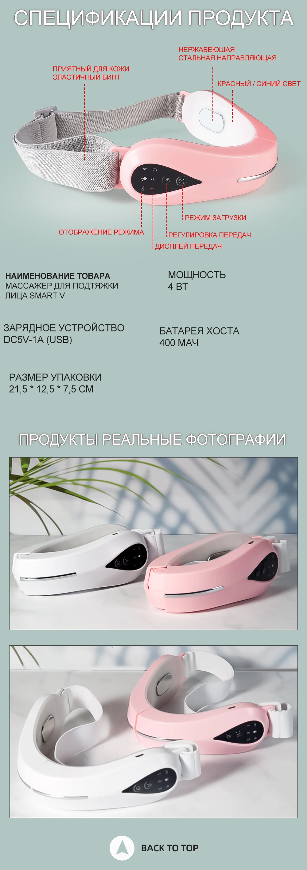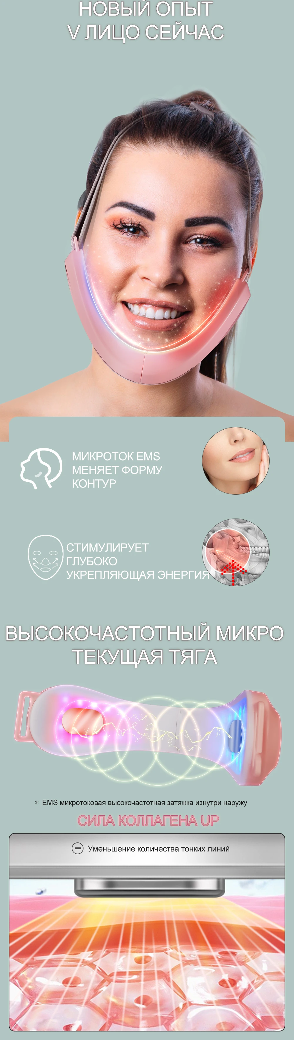 Описание:* 1. Материал: АБС-пластик* 2. Цвет: розовый, белый* 3. Размер: 16*13*5 см* 4. Батарея: 400 мАч* 5. Входное напряжение: 5 В пост 1A* 6. Мощность: 4 Вт* 7. Вес: 186 гОсобенности:* 1. Красный и синий свет микро-ток, может повысить циркуляцию крови, затянуть и сделать вашу кожу упругой.* 2. Эргономичный дизайн, который идеально подходит для линий лица, не давит, удобно носить.* 3. Простота в эксплуатации, одна кнопка открытия, складная конструкция для удобства переноски и хранения.* 4. Подходит для людей, которые хотят придать форму v-образной линии лица, подтягивать и подтягивать, уменьшать жир на лице.* 5. 15 минут в день, 5 раз в неделю, тонкие линии уменьшат за 60 дней при непрерывном использовании.Пакет включает в себя:1х Массажер для коррекции лица1x ремень1x кабель для зарядки1x руководство