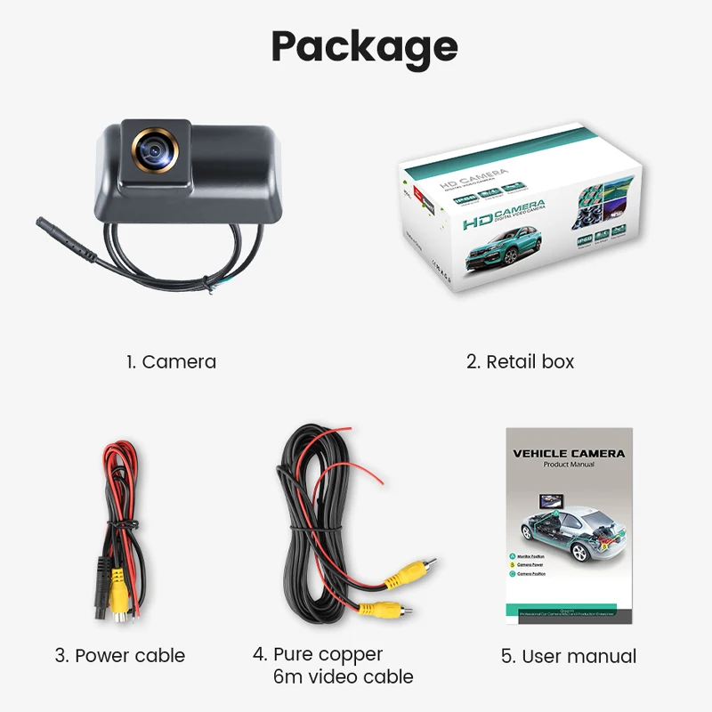 1. Камера заднего вида2. Розничная коробка3. Кабель питания4. Чистый медный 6 м видео кабель5. Руководство пользователя