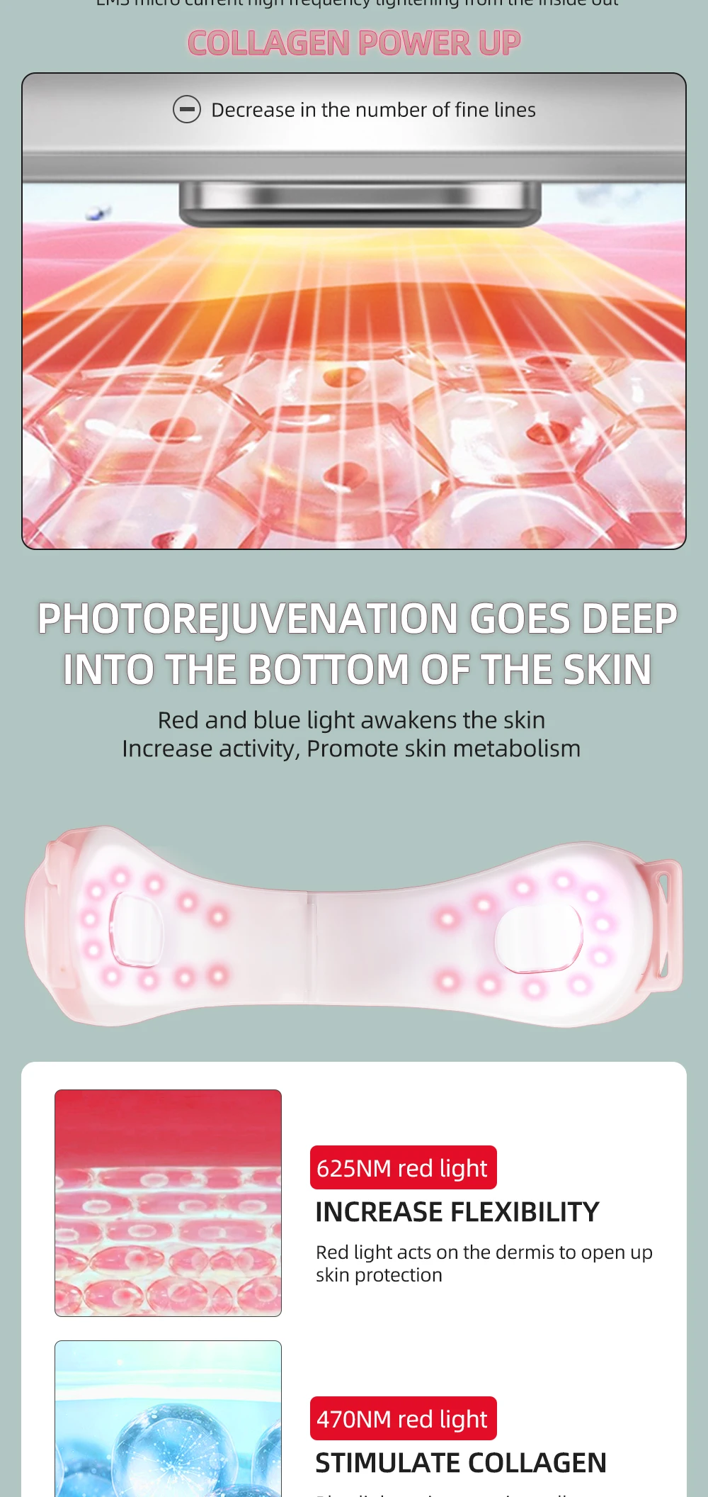 Описание:* 1. Материал: АБС-пластик* 2. Цвет: розовый, белый* 3. Размер: 16*13*5 см* 4. Батарея: 400 мАч* 5. Входное напряжение: 5 В пост 1A* 6. Мощность: 4 Вт* 7. Вес: 186 гОсобенности:* 1. Красный и синий свет микро-ток, может повысить циркуляцию крови, затянуть и сделать вашу кожу упругой.* 2. Эргономичный дизайн, который идеально подходит для линий лица, не давит, удобно носить.* 3. Простота в эксплуатации, одна кнопка открытия, складная конструкция для удобства переноски и хранения.* 4. Подходит для людей, которые хотят придать форму v-образной линии лица, подтягивать и подтягивать, уменьшать жир на лице.* 5. 15 минут в день, 5 раз в неделю, тонкие линии уменьшат за 60 дней при непрерывном использовании.Пакет включает в себя:1х Массажер для коррекции лица1x ремень1x кабель для зарядки1x руководство