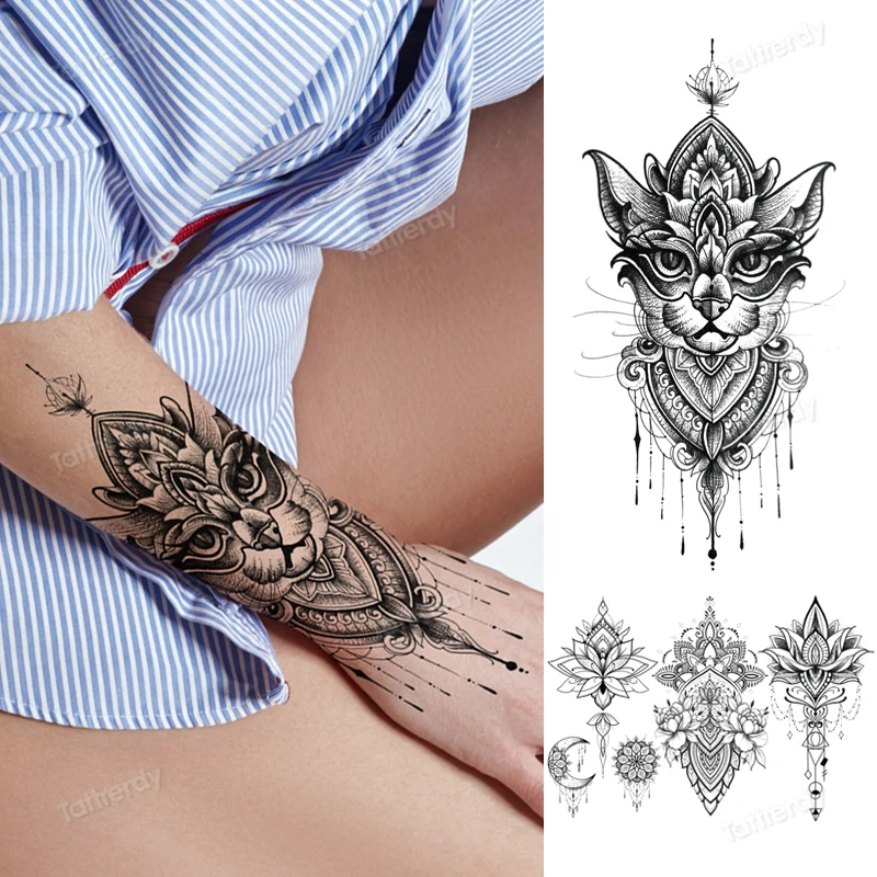Тату-наклейка на руку, нарукавник, черный цвет, искусственная Сексуальная тату для женщин, временная тату-наклейка, мандала, Сова, кот, лотос, цветок