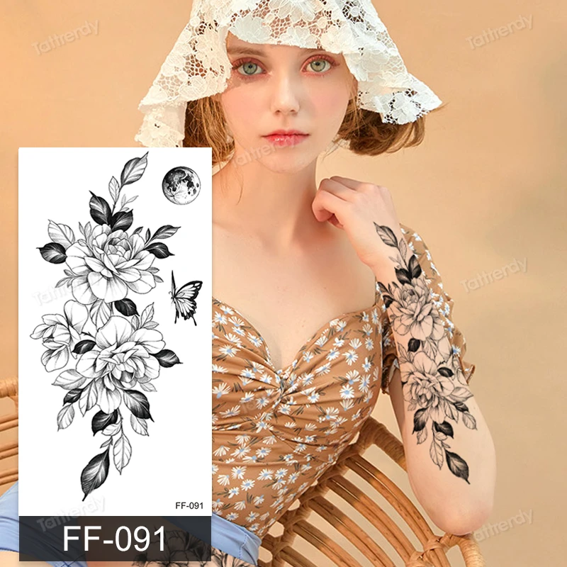 Модный черно-белый цветок тату стикер женский боди-арт Пион Роза Во...