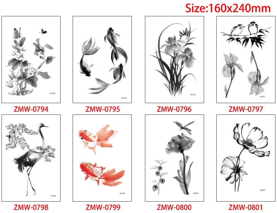 Временная тату-наклейка, китайская чернильная живопись, Цветочный стиль, простой черный поддельный боди-арт, макияж, большой дизайн, рыба, сосновый кран, наклейка