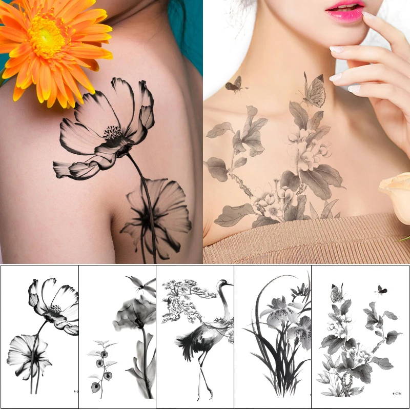 Временная тату-наклейка, китайская чернильная живопись, Цветочный стиль, простая черная искусственная татуировка для боди-арта, макияж, большой дизайн, переводка с рыбкой, сосновой краной