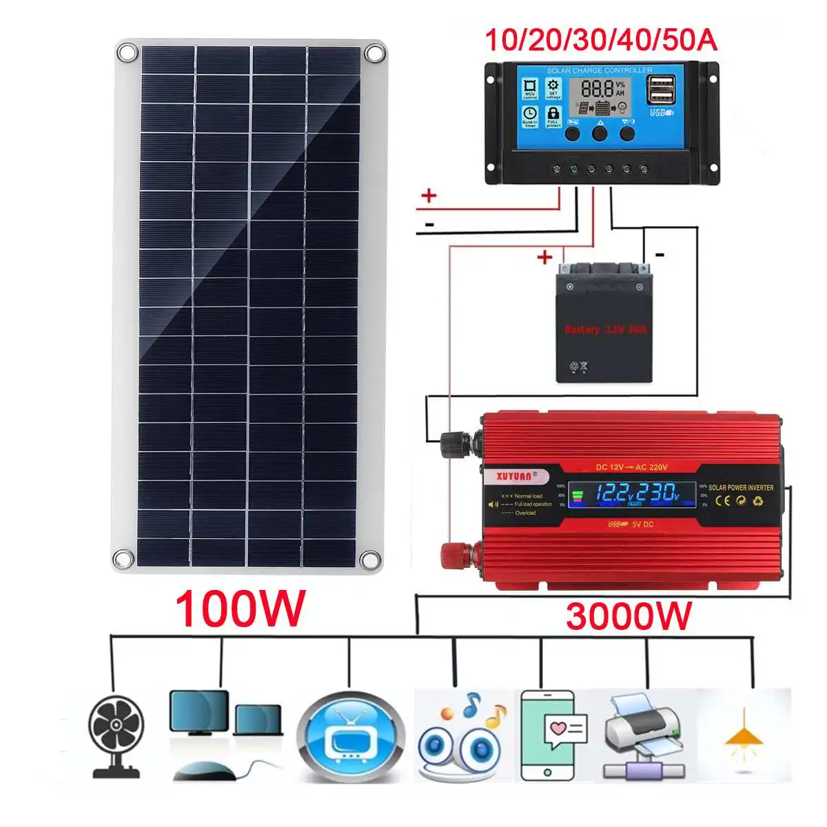Система солнечной энергии 3000 Вт, зарядное устройство 100 Вт, солнечная панель 10-50 А, контроллер заряда, полная мощность, домашний сетевой лагерь