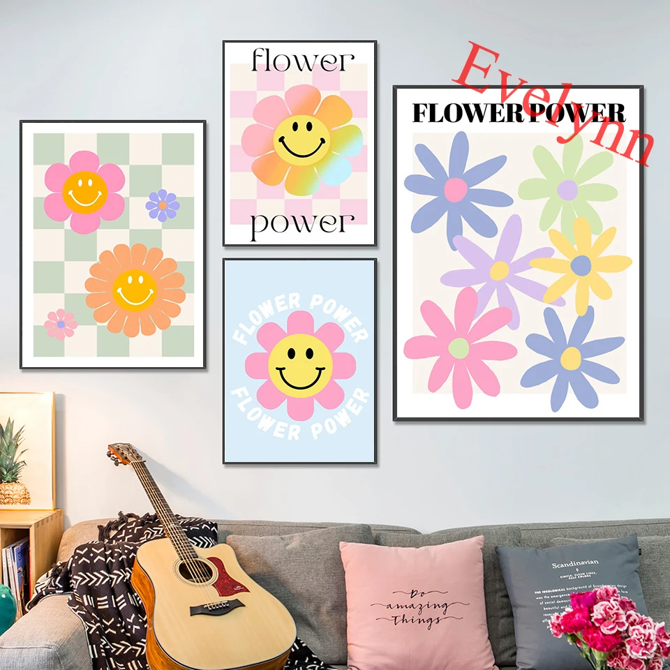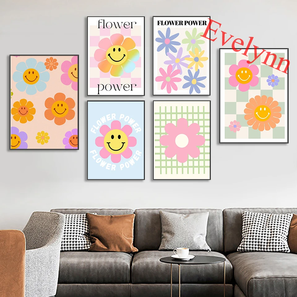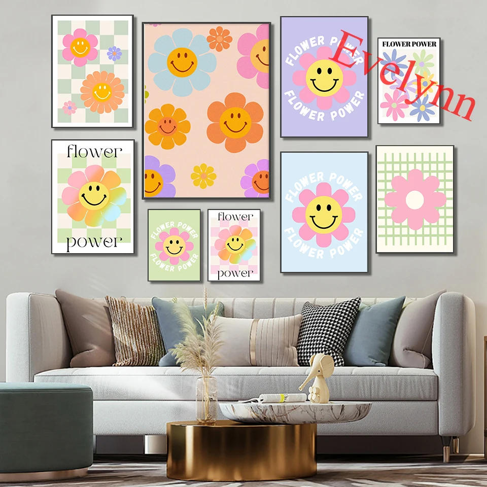 Художественные плакаты со смайликом, пастельный цветочный принт 70-х годов, ретро хиппи арт, галерея стен, домашний декор, холст, настенные художественные принты