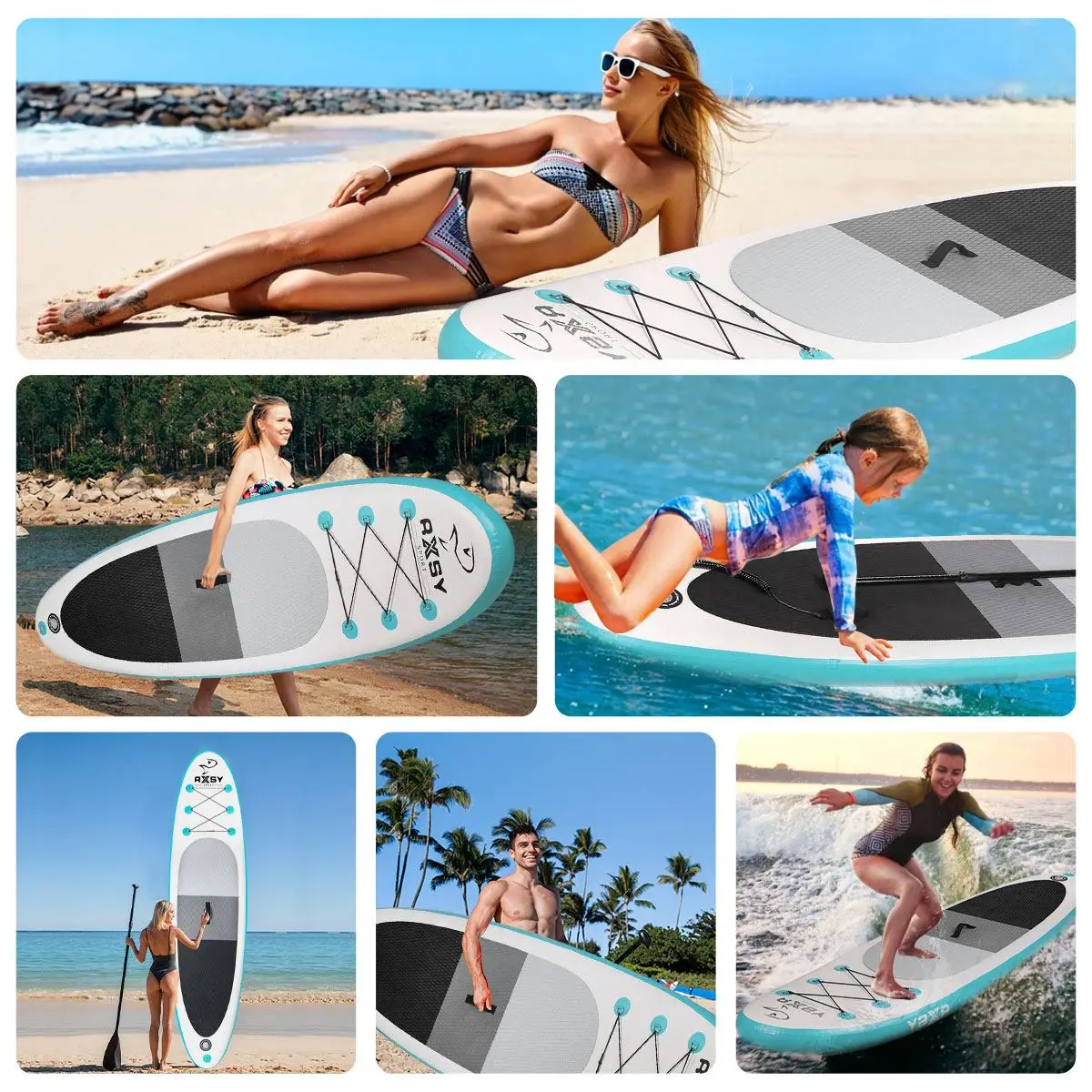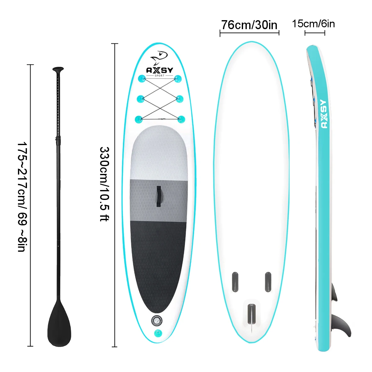 -- SUP надувная доска для серфинга: длина: 320 см (10,5 футов); Ширина деки: 76 см (30 дюймов); Толщина: 15 см (6 дюймов), толстое жесткое основание 6 дюймов улучшает стабильность и равновесие в положении стоя. Регулируемые лопасти лопастей позволяют водителю менять длину лопасти в зависимости от его высоты нескользящий коврик для палубы очень подходит для начинающих и опытных.