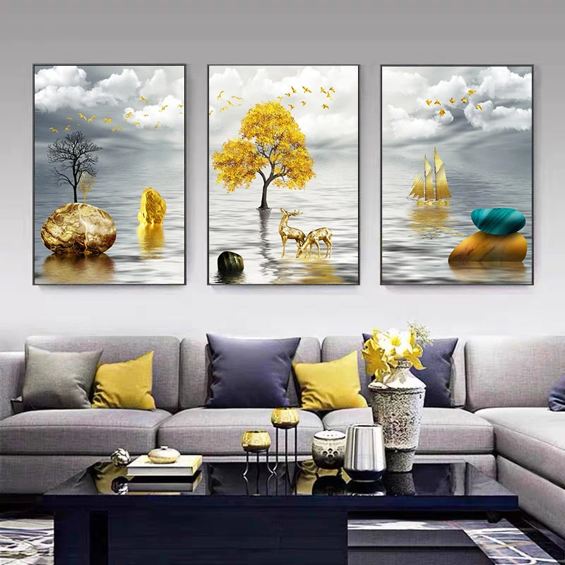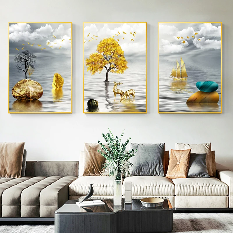 Абстрактная Картина на холсте с изображением золотого дерева и каменного озера