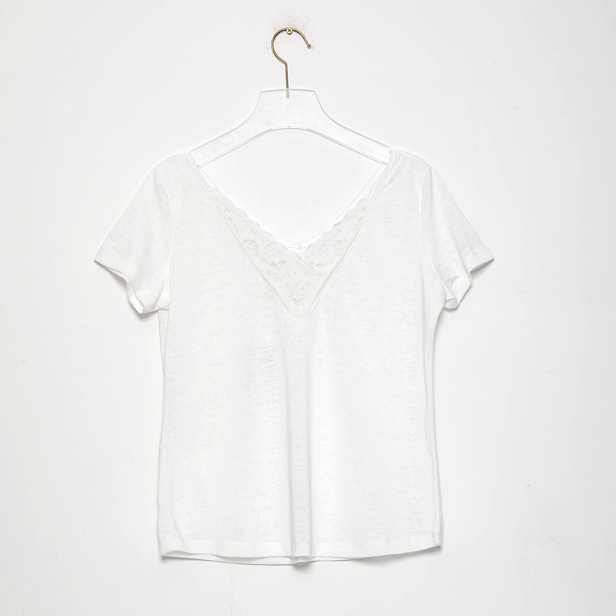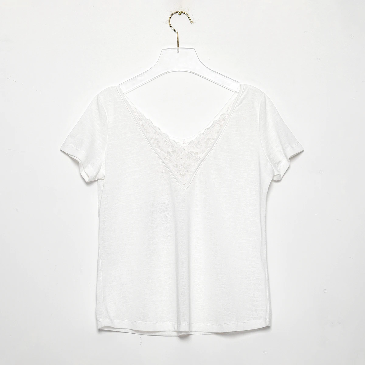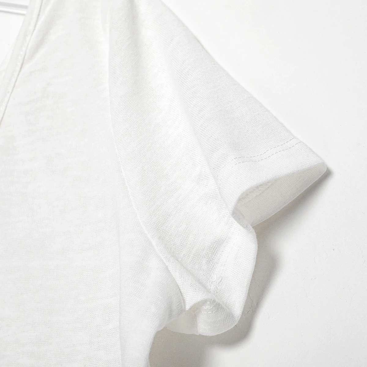 Женская льняная футболка с коротким рукавом, V-образным вырезом и открытой спиной