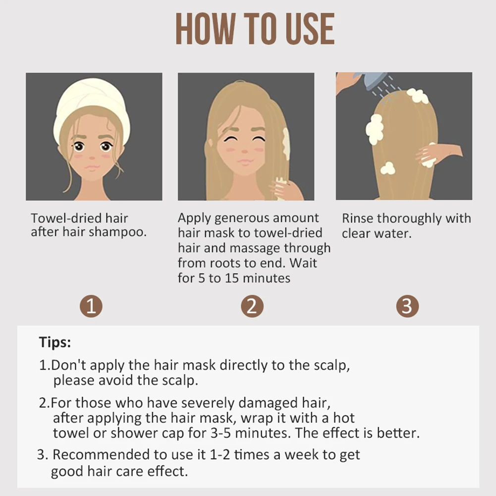 * 2. Возьмите соответствующее количество маски для волос и массируйте от корня до конца, подождите 5-15 минут.