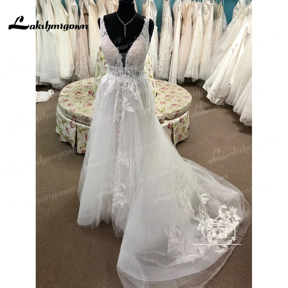 Шикарное кружевное свадебное платье в стиле бохо, модель 2022 года, трапециевидный лиф без подкладки, строгое свадебное платье с глубоким V-образным вырезом и шлейфом