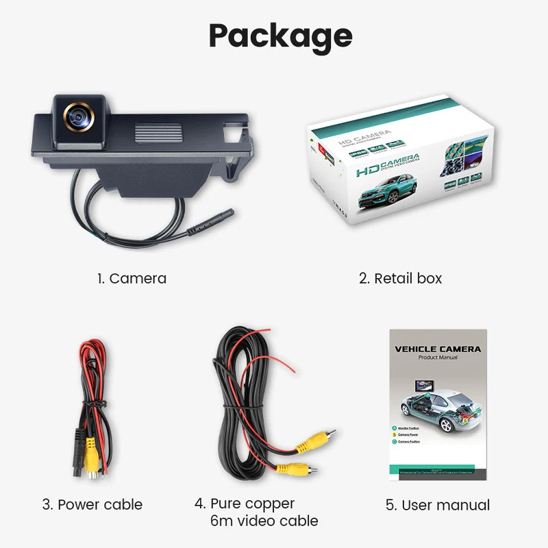 1. Камера заднего вида2. Розничная коробка3. Кабель питания4. Чистый медный 6 м видео кабель5. Руководство пользователя