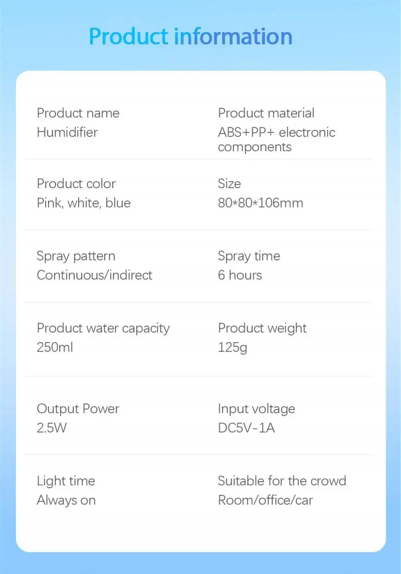 Холодный туман: безопасно увлажняет воздух до 8 часов непрерывной работы, так что вы можете легко дышать и получить более спокойный сон.