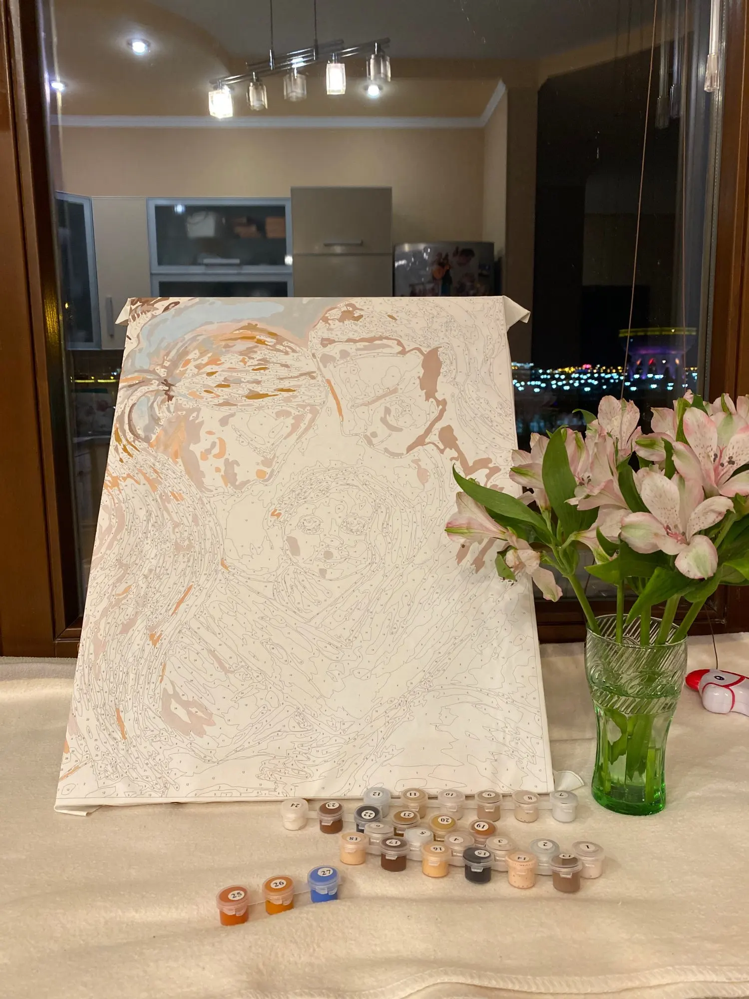 Доставили быстро, краски упакованы в вакуум , цвета красивые и все здорово. На раму надо натянуть холст это не самое приятное , но ничего сложного на деле не оказалось, главное крест накрест делать, я на ютубе посмотрела советы) рекомендую!