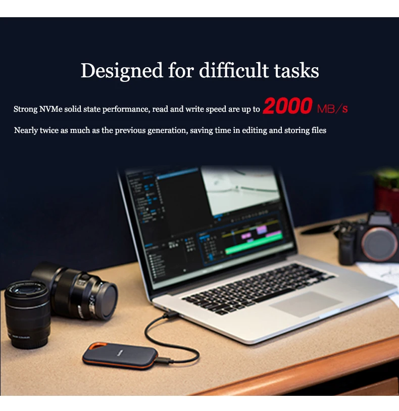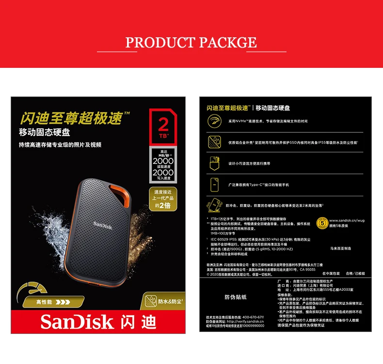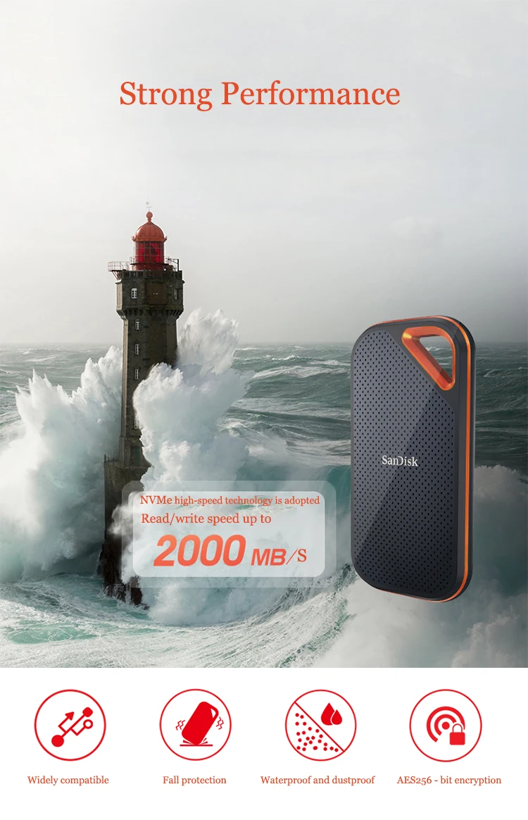 SanDisk-Внешний порт SSD de2TB, NVMe, высокая скорость передачи данных 2000 МБс., USB 3,1