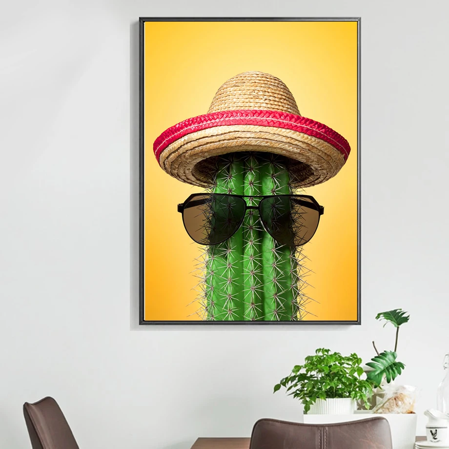 Картина на холсте для гостиной, кактус с шляпой и солнцезащитными очками, забавные современные растения, настенные художественные постеры и принты в скандинавском стиле, домашний декор